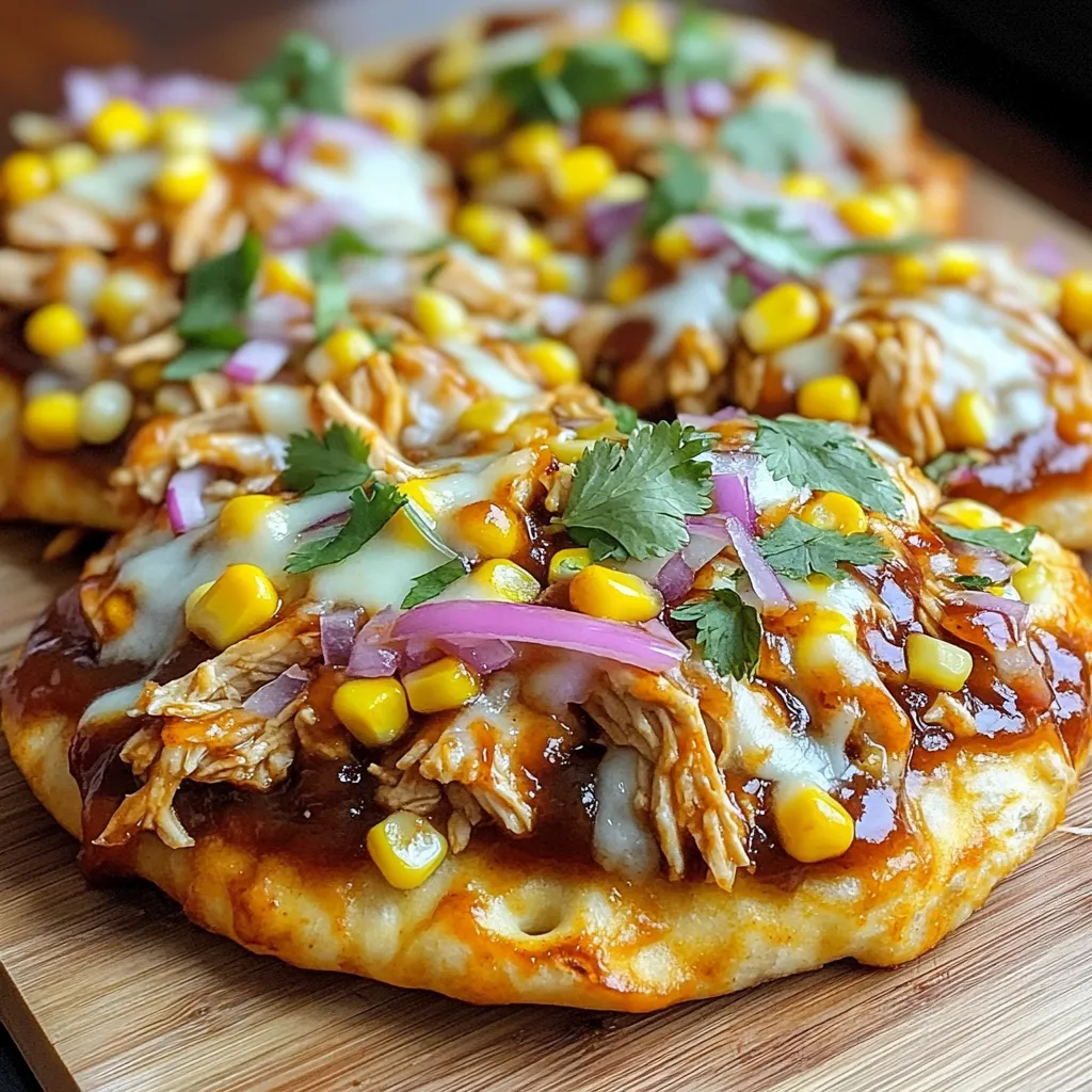 These ingredients make a perfect mix for BBQ chicken flatbreads. The flatbreads serve as a great base. The chicken adds protein and flavor. BBQ sauce brings sweetness and tang. Mozzarella cheese melts beautifully and adds creaminess. Red onion gives a nice crunch and bite. Fresh cilantro brightens the dish. Corn adds a pop of sweetness. Olive oil helps with browning and crispiness. Seasoning with salt and pepper enhances all the flavors.