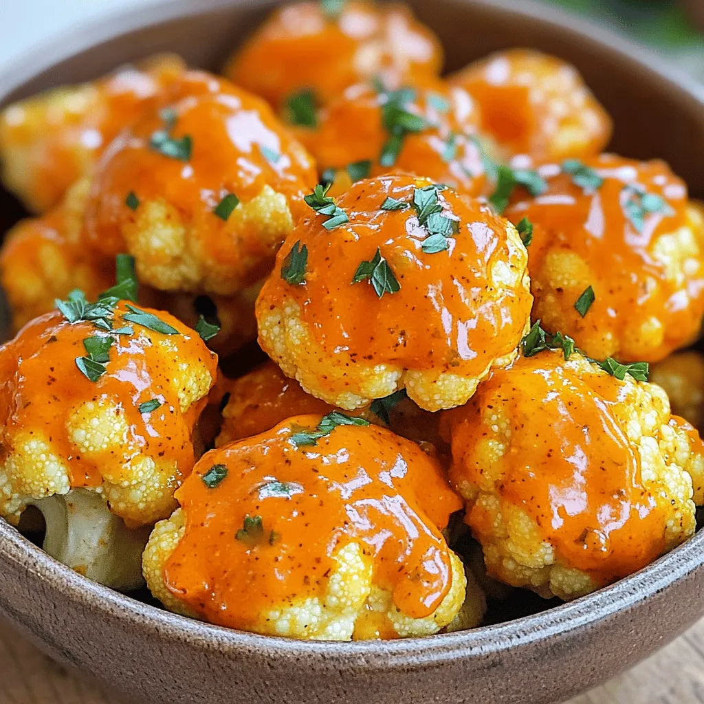 Buffalo cauliflower bites are great as a snack or appetizer. Serve them with a side of ranch or blue cheese dressing. You can also add fresh veggies like carrots and celery for crunch. Pair them with a cold drink for a fun game day treat. If you want to elevate your dish, sprinkle some chopped green onions or cilantro on top before serving.