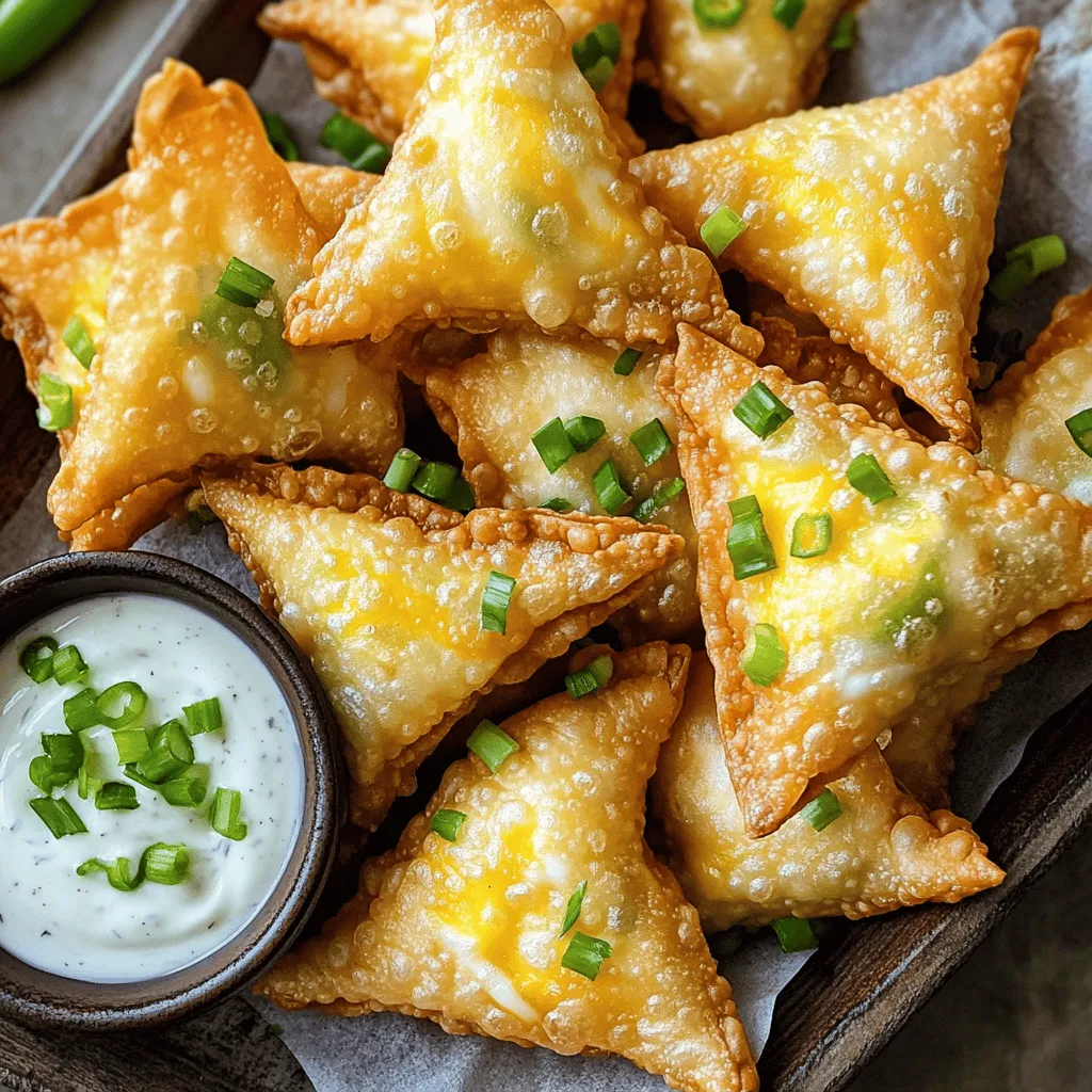 - 1 package of wonton wrappers (about 20-30 wrappers) - 8 oz cream cheese, softened - 1 cup shredded sharp cheddar cheese - 2-3 jalapeños, finely chopped (seeds removed for less heat) - 2 tablespoons green onions, finely chopped - 1 teaspoon garlic powder - 1 teaspoon onion powder - Salt and pepper, to taste - Cooking spray or olive oil spray When I make Air Fryer Jalapeño Popper Wontons, I start with the main ingredients. Wonton wrappers are key. They are thin and crispy, perfect for holding the filling. Next, I use cream cheese. It gives a creamy base that melts in your mouth. I also add sharp cheddar cheese for a rich flavor. For the additional ingredients, I chop 2-3 jalapeños. I remove the seeds to tame the heat. Green onions add a fresh taste. I include garlic and onion powder for depth in flavor. I finish with seasoning. Salt and pepper help to enhance all the flavors. A light spray of cooking spray or olive oil spray ensures a crispy texture when air frying. These ingredients blend to create a snack that's both tasty and fun to eat. To make the filling, first, grab a large mixing bowl. Add 8 oz of softened cream cheese and 1 cup of shredded sharp cheddar cheese. Next, chop 2-3 jalapeños finely, removing the seeds if you want less heat. Add the jalapeños to your bowl, along with 2 tablespoons of finely chopped green onions. Sprinkle in 1 teaspoon each of garlic powder and onion powder, along with salt and pepper to taste. Mix everything until it is well blended and creamy. This is where the magic begins! Now, it's time to assemble the wontons. Lay one wonton wrapper on a clean surface. Spoon about 1 tablespoon of the cheese mixture onto the center of the wrapper. Moisten the edges of the wrapper with a little water using your finger or a brush. Fold the wrapper over to form a triangle, pressing the edges together to seal. Make sure to push out any air pockets. Repeat this process until you use all the filling. Your wontons should look neat and inviting! Before cooking, preheat your air fryer to 375°F (190°C) for about 3-5 minutes. While it heats up, lightly spray both sides of the wontons with cooking spray. This helps them crisp up nicely. Place the wontons in a single layer in the air fryer basket. You may need to work in batches. Air fry the wontons for 6-8 minutes or until they turn golden brown and crispy. Once you take them out, let them cool for a minute before serving. Enjoy your tasty snack! To make the best jalapeño popper wontons, focus on avoiding air pockets. When you fill the wonton wrapper, make sure to press out any air before sealing. This keeps the filling intact while cooking. A tightly sealed wonton also helps it crisp up better. Next, ensure a crispy texture by not overcrowding the air fryer basket. Place the wontons in a single layer. This allows hot air to circulate freely. Lightly spray them with cooking spray for extra crunch. When serving your wontons, think about ideal pairings for dipping sauces. Ranch dressing is a classic choice. A spicy dipping sauce can add an extra kick. You can also serve them with a sweet chili sauce for a fun contrast. For presentation, arrange the wontons on a platter. Sprinkle chopped green onions on top for color. You want them to look as good as they taste! If you want to reduce the spice level, remove all the seeds from the jalapeños. This helps make the wontons milder. You can also replace jalapeños with sweet peppers for a non-spicy version. For dietary preferences, consider substitutions. Use low-fat cream cheese for a lighter option. If you need a dairy-free choice, try a vegan cream cheese. You can mix in some nutritional yeast for added flavor! {{image_2}} You can easily change the cheese in your wontons. Try mozzarella for a milder flavor. Or use pepper jack for a spicy twist. Mixing cheeses can add depth to the taste. You can also add proteins or vegetables. Cooked chicken or bacon gives a hearty bite. For a veggie option, try corn or spinach. These swaps keep your dish fresh and fun. Spices can bring a new kick to your wontons. Adding cayenne pepper or smoked paprika gives heat and depth. Experiment with chili powder for a different flavor. You can also play with sweet and savory. Try a touch of honey in your cheese mixture. This adds a nice balance to the heat of the jalapeños. You can bake these wontons if you want a different texture. Preheat your oven to 400°F (200°C). Place the wontons on a baking sheet and bake for about 15 minutes. They will turn crispy and golden. If you don't have an air fryer, try shallow frying them in oil. Heat oil in a pan and fry until golden. This gives a traditional fried texture that many love. After enjoying your Air Fryer Jalapeño Popper Wontons, store leftovers right away. Keep them in an airtight container. They will stay fresh in the fridge for up to three days. To freeze, place the wontons in a single layer on a baking sheet. Freeze them until solid, then move them to a freezer-safe bag. This method helps prevent them from sticking together. You can keep them in the freezer for up to three months. When you're ready to enjoy leftovers, reheating them properly is key. The best way to keep them crispy is to use the air fryer. Preheat your air fryer to 350°F (175°C). Place the wontons in a single layer and heat for about 4-5 minutes. This will help them regain their crunch. You can also use an oven. Set it to 350°F (175°C) and bake for about 10 minutes. Be sure to check them often. Knowing when to discard your wontons is important. If they smell off or look discolored, it’s best to throw them away. In the fridge, they last about three days. Frozen wontons can last three months. After that, their taste and texture may decline. Always trust your senses when deciding if food is safe to eat. Making these wontons is quick and easy. It takes about 15 minutes to prep. After that, cooking them in the air fryer takes another 6 to 8 minutes. So, in total, you will need 