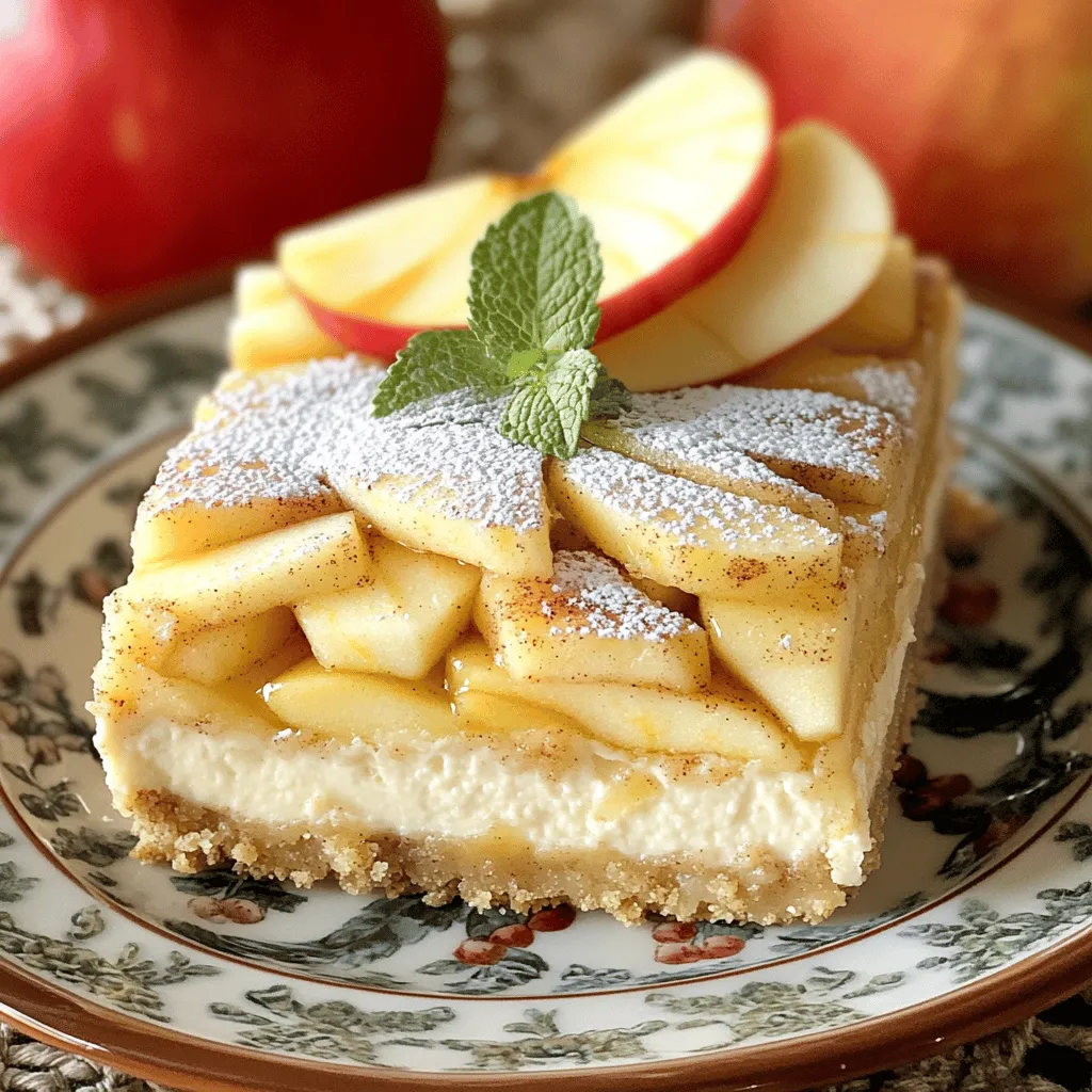 To make your cheesecake bars look beautiful, chill them well before serving. Use a sharp knife to cut clean slices. This helps maintain neat edges. Dust with powdered sugar for a sweet touch. Garnish each slice with a fresh apple slice and a sprig of mint. This adds color and freshness to your dessert. Serve them on a decorative plate for an eye-catching display.