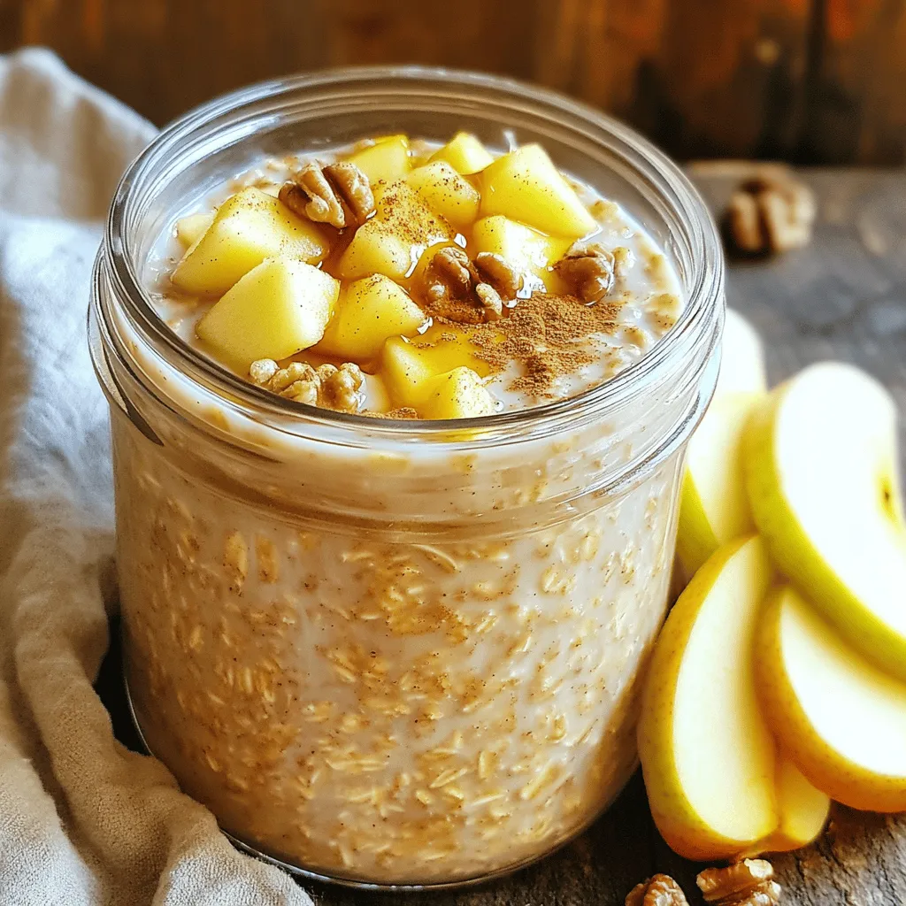 To make this healthy meal, gather these simple ingredients: - 1 cup rolled oats - 2 cups almond milk (or any milk of choice) - 1 apple, diced (preferably a sweet variety like Fuji or Honeycrisp) - 1 teaspoon ground cinnamon - 2 tablespoons maple syrup (or honey) - 1/4 cup Greek yogurt (optional, for creaminess) - 1/4 cup walnuts, chopped (or your favorite nuts) - A pinch of salt - Extra apple slices and cinnamon for topping Each ingredient in Apple Cinnamon Overnight Oats brings health benefits. - Rolled oats: They are high in fiber. This helps with digestion and keeps you full. - Almond milk: A low-calorie option, it is rich in vitamins and minerals. - Apples: Apples add sweetness and provide vitamins. They are also high in fiber. - Cinnamon: This spice may help lower blood sugar. It adds flavor without calories. - Maple syrup: A natural sweetener, it contains antioxidants. - Greek yogurt: This adds protein and creaminess. It’s good for your gut. - Walnuts: They are packed with healthy fats and can boost brain health. You can easily swap ingredients based on your needs: - Rolled oats: Use quick oats if you need them to soak faster. - Almond milk: Any milk works, like cow's milk or oat milk. - Apple: Any sweet apple will work, such as Gala or Granny Smith. - Maple syrup: Honey or agave syrup can replace maple syrup. - Greek yogurt: For a dairy-free option, use coconut yogurt. - Walnuts: Any nuts, like almonds or pecans, can be used. Now you have everything you need to get started on your Apple Cinnamon Overnight Oats. For the full recipe, check out the detailed instructions and enjoy a tasty and healthy meal! To make Apple Cinnamon Overnight Oats, start by gathering your ingredients. You will need rolled oats, almond milk, a diced apple, ground cinnamon, maple syrup, Greek yogurt, chopped walnuts, salt, and some extra apple slices for topping. In a medium bowl, mix the rolled oats and almond milk first. Then add the diced apple, ground cinnamon, maple syrup, and a pinch of salt. If you want creaminess, add Greek yogurt too. Stir everything well until it is nicely blended. Mixing is key to great overnight oats. Make sure you break up any clumps of oats. A sturdy spoon or spatula works best. You want every oat to soak up the milk and flavors. Mixing ensures you get a tasty bite every time you dig in. Take your time with this step. It’s worth it for the perfect blend of flavors! After mixing, divide the mixture into jars or containers. Use ones with lids for easy storage. Top each jar with chopped walnuts for crunch. Seal the jars and place them in the fridge. Let the oats sit overnight, or at least for four to six hours. This resting time helps the oats absorb the liquid. When ready to eat, stir the oats again. If they are too thick, add a splash of almond milk. Finish with apple slices and a sprinkle of cinnamon. Enjoy this healthy meal! For the full recipe, check the earlier section. To make the best overnight oats, start with rolled oats. They soak well and keep a nice texture. Use a good ratio of oats to liquid. I suggest one part oats to two parts milk. This ensures they stay creamy, not too runny. Mix all your ingredients well before refrigerating. Stirring lets the flavors blend. If you want more creaminess, add Greek yogurt. It makes the oats rich and smooth. Also, remember to add a pinch of salt. This helps balance the sweetness. You can boost the flavor of your overnight oats with extras. Try adding nuts for crunch. Chopped walnuts work great, but almonds or pecans are tasty too. Dried fruits like raisins or cranberries add sweetness and chewiness. Want a spice kick? Mix in nutmeg or ginger. You can also swap maple syrup for honey or agave. These small changes can make a big difference. Avoid using instant oats. They can turn mushy and lose texture. Stick to rolled oats for the best outcome. Don’t skip the soaking time. This step is key for the oats to absorb the milk and flavors. Also, watch your liquid amount. Too much can make your oats soupy. If it’s too thick, you can always add milk before eating. Lastly, remember to seal your containers well. This keeps the oats fresh and tasty overnight. For a full recipe, check out the Apple Cinnamon Overnight Oats 🥣. {{image_2}} You can play with flavors in your apple cinnamon overnight oats. Want a nutty twist? Add some almond butter or peanut butter to the mix. This will make it creamy and rich. For a fruity touch, toss in some berries or sliced bananas. These fruits add a pop of color and flavor. You can even swap apples for pears if you like. Each fruit brings a new taste to the dish. If you need a gluten-free option, use certified gluten-free oats. Most rolled oats are safe, but always check the label. You want to ensure there is no cross-contamination. Almond milk is naturally gluten-free, which is great for this recipe. The other ingredients, like maple syrup and nuts, are also gluten-free. This way, everyone can enjoy a tasty breakfast without worry. To make your overnight oats vegan, simply skip the Greek yogurt. Instead, add a bit more almond milk or use coconut yogurt for creaminess. You can also use agave syrup instead of honey. Both sweeteners will keep the taste sweet and enjoyable. With these simple swaps, you keep the dish healthy and plant-based. You can enjoy a delicious meal that fits your diet perfectly. Try these variations to keep your apple cinnamon overnight oats exciting. Each option allows you to explore new flavors while sticking to the healthy basics of the recipe. For the full recipe, check the previous section. To keep your Apple Cinnamon Overnight Oats fresh, store them in the fridge. Use airtight containers or jars. This helps keep out air and moisture, which can spoil your oats. Make sure the lids fit well. You can also keep them in the back of the fridge, where it's coolest. You can store your prepared overnight oats in the fridge for up to five days. After that, they may lose their taste and