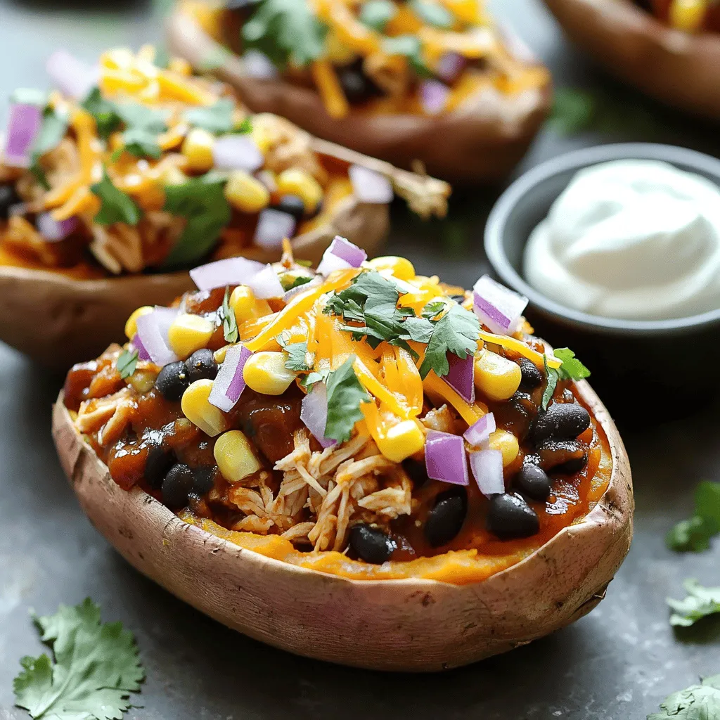 - 4 medium sweet potatoes - 2 cups cooked chicken, shredded - 1 cup BBQ sauce (your choice) - 1 cup black beans, rinsed and drained - 1 cup corn (fresh or frozen) - 1/2 red onion, finely chopped - 1 teaspoon cumin - 1/2 teaspoon garlic powder - 1 cup shredded cheddar cheese - Chopped fresh cilantro for garnish - Sour cream for serving (optional) - Oven - Baking tray - Mixing bowl - Fork Sweet potatoes bring a sweet flavor to your meal. Shredded chicken adds protein and heartiness. BBQ sauce gives a smoky kick. Black beans and corn add texture and color. For optional ingredients, red onion gives a nice crunch. Cumin and garlic powder add depth to the filling. Cheddar cheese melts deliciously on top. Fresh cilantro brightens the dish. Sour cream adds creaminess, but it's not a must. You need some basic gear to make this meal. An oven cooks the sweet potatoes perfectly. A baking tray holds them while they bake. A mixing bowl helps combine all your filling ingredients. A fork is handy for piercing the sweet potatoes before baking. Gather these items, and you are ready to create a tasty BBQ chicken stuffed sweet potato! 1. Preheating the oven Start by preheating your oven to 400°F (200°C). This heat will cook the sweet potatoes just right. 2. Scrubbing and piercing the sweet potatoes Take the medium sweet potatoes and scrub them well under running water. Pierce each sweet potato several times with a fork. This helps steam escape while they bake. 3. Baking time and checking doneness Place the sweet potatoes on a baking tray lined with parchment paper. Bake them for about 45-50 minutes. To check doneness, poke them with a fork; they should feel soft. 1. Combining shredded chicken and BBQ sauce While the sweet potatoes bake, grab a mixing bowl. Combine 2 cups of shredded chicken with 1 cup of your favorite BBQ sauce. 2. Adding black beans, corn, and spices Next, add 1 cup of rinsed black beans and 1 cup of corn. Mix in 1/2 finely chopped red onion, 1 teaspoon of cumin, and 1/2 teaspoon of garlic powder. 3. Mixing and seasoning the filling Stir everything well, and season with salt and pepper to taste. This filling will be packed with flavor. 1. Cutting and scooping out the sweet potatoes After baking, let the sweet potatoes cool for a few minutes. Cut them open lengthwise and carefully scoop out some flesh. Be gentle to keep the skins intact. 2. Filling with BBQ chicken mixture Generously fill each sweet potato with the BBQ chicken mixture. Press it down a bit to fit it all in. 3. Melting cheese and final bake Top each stuffed sweet potato with 1 cup of shredded cheddar cheese. Return them to the oven and bake for another 10-15 minutes, until the cheese is melted and bubbly. Now you’re ready to enjoy a hearty meal! To bake sweet potatoes perfectly, choose medium-sized ones. Wash them well and pierce each one with a fork. This helps steam escape. Bake them at 400°F (200°C) for 45-50 minutes. They should feel soft when you poke them with a fork. For an extra tasty BBQ chicken filling, mix your shredded chicken with your favorite BBQ sauce. Add black beans and corn for texture. Red onion, cumin, and garlic powder boost the flavor. Make sure to season with salt and pepper. This blend creates a rich, smoky taste. Garnish your stuffed sweet potatoes with chopped fresh cilantro. It adds color and flavor. You can also drizzle some sour cream on top if you like. For side dishes, pair them with a simple green salad or coleslaw. These sides add crunch and balance. For a low-calorie option, use less cheese or skip it entirely. You can also swap sweet potatoes for a lighter veggie like zucchini or bell peppers. If you need gluten-free options, check your BBQ sauce. Many sauces are gluten-free. For proteins, try shredded turkey or plant-based meat. This keeps your meal healthy and tasty. {{image_2}} You can switch up the meat in this dish. Pulled pork works great instead of chicken. The tender pork mixes well with the sweet potatoes. You can also use ground beef if you want something heartier. For a vegetarian twist, try plant-based proteins. Use lentils or chickpeas instead of chicken. They soak up the flavors and add protein, too. Don't be afraid to play with BBQ sauce. Try different flavors like sweet, spicy, or smoky. Each sauce brings a new taste to the dish. You can also add more veggies. Try bell peppers, zucchini, or even spinach for extra nutrients. Mixing in these veggies adds color and crunch. Toppings can make this meal even better. If you're not a fan of cheddar, swap it out for mozzarella or feta cheese. They melt nicely and add a different taste. Also, think about adding garnishes. Chopped green onions or creamy avocado can really enhance your meal. They add freshness and a nice look to your plate. To store stuffed sweet potatoes in the fridge, let them cool first. Place them in an airtight container. They stay fresh for up to four days. You can enjoy them warm or cold. To freeze stuffed sweet potatoes, wrap each one in plastic wrap. Then, place them in a freezer bag. They last for up to three months. When ready to eat, thaw them in the fridge overnight. For the best taste and texture, reheat them in the oven. Preheat to 350°F (175°C) and heat for about 20 minutes. You can also use the microwave. Just heat for two to three minutes. The oven gives a crispier skin, while the microwave is quicker. Choose what works best for you! Can I make BBQ chicken stuffed sweet potatoes ahead of time? Yes, you can prepare these ahead of time. Bake the sweet potatoes, cool, and stuff them. Cover and store in the fridge for up to two days. When ready, just reheat in the oven until warm. What types of BBQ sauce work best? You can use any BBQ sauce you like. Sweet, smoky, or tangy sauces work well. If you want a kick, try spicy BBQ sauce. Choose a sauce that matches your taste. Are there vegan-friendly substitutes for this recipe? Yes! You can use jackfruit or chickpeas instead of chicken. Make sure to use