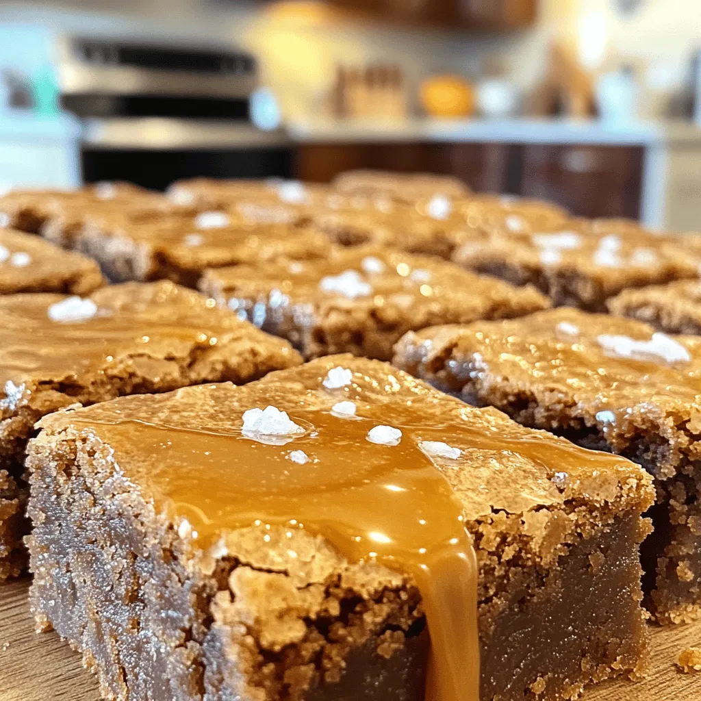 To make the best Brown Butter Salted Caramel Blondies, you need some key ingredients. Here’s what you will need: - 1 cup unsalted butter (2 sticks) - 1 cup brown sugar, packed - 1/2 cup granulated sugar - 2 large eggs - 2 teaspoons vanilla extract - 2 cups all-purpose flour - 1 teaspoon baking powder - 1/2 teaspoon baking soda - 1/2 teaspoon salt - 1 cup salted caramel sauce (store-bought or homemade) - Flaky sea salt, for topping Each ingredient plays a special role. The unsalted butter gives a rich flavor. Brown sugar adds moisture and a deep sweetness. The eggs bind the mix together, while vanilla extract brings warmth. Flour forms the base, and baking powder and soda help it rise. Salt balances the sweetness, making every bite perfect. The salted caramel sauce adds a gooey, sweet layer that makes these blondies a treat. Finally, the flaky sea salt on top gives a lovely finish. Using high-quality ingredients always pays off. Fresh eggs and quality butter make a big difference. You can even make your own salted caramel for extra flair. Remember, each ingredient counts, so choose wisely! - Preheat the oven to 350°F (175°C). - Grease and line a 9x13 inch baking pan with parchment paper. Leave some overhang for easy removal. - Melt the butter in a medium saucepan over medium heat. - Stir frequently until it foams and turns a golden brown, about 5-7 minutes. - Remove from heat and let it cool slightly. - In a large mixing bowl, combine the brown sugar and granulated sugar. - Pour the warm browned butter into the sugar and mix well until combined. - Add the eggs one at a time, then mix in the vanilla extract. - In a separate bowl, whisk together the flour, baking powder, baking soda, and salt. - Gradually add this dry mix to the wet ingredients. Stir carefully until just combined. - Pour half of the blondie batter into the prepared pan. Spread it evenly. - Drizzle half of the salted caramel sauce over this layer. - Pour the remaining batter on top and drizzle with the rest of the caramel. - Use a knife to swirl the caramel slightly into the batter. - Bake in the preheated oven for 20-25 minutes. - The edges should be golden brown, and a toothpick should come out with a few moist crumbs. - After baking, let the blondies cool in the pan for about 10 minutes. - While still warm, sprinkle flaky sea salt on top for that perfect finish. - Once the blondies have cooled completely, lift them out of the pan using the parchment paper. - Slice into squares or rectangles. Enjoy these delicious treats! To make perfect blondies, avoid overmixing the batter. Stir just until the flour disappears. This keeps your blondies chewy and soft. Next, ensure the right baking time. Bake at 350°F for 20-25 minutes. Look for golden edges and a toothpick that comes out with a few moist crumbs. If you don’t have unsalted butter, use salted butter. Just skip adding the extra salt. For homemade salted caramel, you can melt sugar until golden. Add heavy cream and salt for a quick version. When serving, cut the blondies into squares. You can add a scoop of ice cream on the side for fun. Garnish your blondies with a caramel drizzle. This makes them look fancy and taste even better. {{image_2}} Adding nuts gives your blondies a nice crunch. I love using walnuts or pecans. These nuts pair well with the sweet caramel. You can chop them coarsely and mix them into the batter. Aim for about 1 cup of nuts. If you like a stronger nut flavor, toast them lightly before adding. This boosts their taste and aroma. The added texture makes each bite more enjoyable. You can play with flavors by adding chocolate chips. Semisweet or dark chocolate chips work well. They add richness to the blondies. You can use about 1 cup of chips. Feel free to mix in other things, too! Try dried fruit like cranberries or cherries. They add a tangy contrast to the sweet caramel. You can even use butterscotch chips for a new twist. The options are endless! If you need gluten-free blondies, you can substitute all-purpose flour with gluten-free flour blends. Look for ones with a good mix of flours. This keeps the texture nice and chewy. For vegan blondies, replace the eggs with flax eggs. Mix 1 tablespoon of ground flaxseed with 2.5 tablespoons of water for each egg. Use vegan butter instead of regular butter. These swaps keep all the flavor while meeting your needs. To keep your Brown Butter Salted Caramel Blondies fresh, store them in an airtight container. Place a layer of parchment paper between layers if you stack them. This helps avoid sticking. Blondies stay fresh at room temperature for up to three days. If you want them to last longer, keep them in the fridge. They can stay good for up to a week when chilled. Freezing blondies is simple. First, let them cool completely. Then, wrap each blondie in plastic wrap. Make sure they are tight and secure. Place the wrapped blondies in a freezer-safe bag or container. They can last in the freezer for up to three months. When you want to enjoy them, take them out and thaw at room temperature. If you're in a hurry, a quick microwave blast for 10-15 seconds works too. Enjoy your sweet treat any time! How do I know when the blondies are done baking? You can check by inserting a toothpick into the center. If it comes out with a few moist crumbs, your blondies are ready. They should have golden edges but still look soft in the middle. Can I make these blondies ahead of time? Yes, you can make these blondies a day before. Just let them cool completely and store them in an airtight container. They taste even better the next day as flavors develop. What can I substitute for salted caramel sauce? If you don’t have salted caramel sauce, you can use regular caramel sauce. You can also make a quick homemade version by melting sugar and mixing it with cream and a pinch of salt. How should I reheat leftovers? To reheat, place a blondie in the microwave for about 10 to 15 seconds. This warms it up without drying it out.
