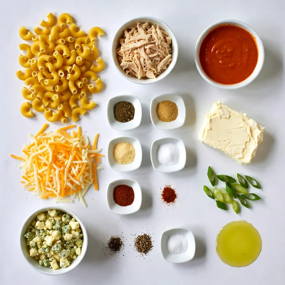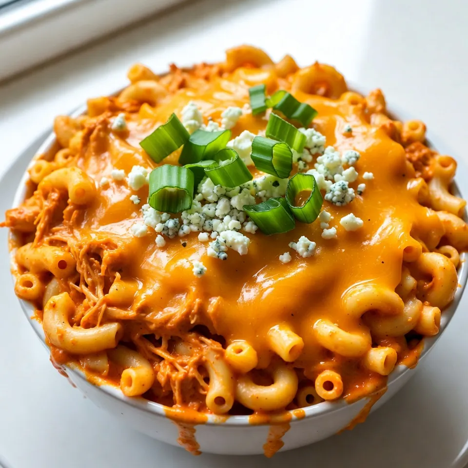 - Elbow macaroni: I like to use 8 ounces of elbow macaroni. This shape holds the cheese sauce well. Cook it until it is al dente. This means it should still have a little bite to it. After cooking, drain it and set it aside. - Chicken and buffalo sauce: For this dish, you need 1 cup of cooked, shredded chicken. You can use leftover chicken or rotisserie chicken for ease. The star is the buffalo sauce. You can choose store-bought sauce or make your own. I recommend using 1 cup of buffalo sauce. It adds the spicy kick that makes this dish special. - Types of cheese to use: The cheese mixture is key to a creamy, rich texture. I use 2 cups of sharp cheddar cheese, shredded. It gives a robust flavor. The sharpness of the cheddar balances the heat from the buffalo sauce. - Cream cheese importance: Don’t skip the cream cheese! You need 1 cup of softened cream cheese. It makes the sauce extra smooth and creamy. It also helps to bind everything together. - Garlic and onion powder benefits: To amp up the flavor, I add 1 teaspoon each of garlic powder and onion powder. These spices enhance the taste without overpowering the dish. They add depth and warmth to every bite. - Optional toppings like blue cheese and green onions: For a fun twist, consider adding toppings. I suggest ½ cup of blue cheese crumbles, if you like that tangy flavor. You can also add ¼ cup of sliced green onions on top for freshness and crunch. These add a pop of color and flavor to your dish. {{ingredient_image_1}} First, bring a large pot of salted water to a boil. This adds flavor to the pasta. Once the water is boiling, add 8 ounces of elbow macaroni. Cook it according to the package directions until it is al dente, which means it's firm but not hard. This usually takes about 7-9 minutes. After cooking, drain the macaroni in a colander and set it aside. In a large skillet, pour in 1 tablespoon of olive oil and heat it over medium heat. Add 1 cup of cooked, shredded chicken to the skillet. Then, pour in 1 cup of buffalo sauce. Stir the chicken and sauce together. Heat this mixture for about 3-4 minutes. Make sure to stir occasionally so it heats evenly. Next, grab a separate saucepan and set it over low heat. Add 1 cup of cream cheese to the pan. Then sprinkle in 1 teaspoon of garlic powder, 1 teaspoon of onion powder, and ½ teaspoon of smoked paprika. Add 1 cup of shredded sharp cheddar cheese to the mixture. Stir until everything melts and becomes smooth. Once your cheese mixture is ready, fold in the cooked macaroni and the buffalo chicken. Mix well until all the ingredients are combined. Season with salt and pepper to taste. Now, transfer the mac and cheese mixture into a greased baking dish. Make sure to spread it evenly in the dish. Sprinkle the remaining 1 cup of cheddar cheese on top. If you like blue cheese, add ½ cup of blue cheese crumbles as well. Preheat your oven to 350°F (175°C). Bake the dish for 15-20 minutes. Watch for the cheese to become bubbly and golden. When it’s done, remove it from the oven and let it cool for a few minutes. Before serving, garnish with freshly sliced green onions. Enjoy your delicious Buffalo Chicken Mac and Cheese! To make the cheese sauce smooth, start with low heat. Mix cream cheese with spices first. This step helps the cheese melt evenly. Add the shredded cheddar slowly and stir until it blends well. If your sauce seems too thick, add a splash of milk. This will keep it creamy and easy to mix with the pasta. You can adjust the spice level to fit your taste. Use less buffalo sauce for a milder dish. If you want more heat, add extra sauce or a dash of hot sauce. Taste the mixture as you go. This way, you can find the perfect balance for your meal. Buffalo chicken mac and cheese pairs well with simple sides. Try serving it with a fresh salad or steamed veggies. The crispness of a salad will balance the creamy dish. For a fun twist, serve it with celery sticks and blue cheese dip on the side. This adds extra flavor and a crunchy texture. Pro Tips Use Leftover Chicken: This recipe is perfect for using up leftover rotisserie chicken or any cooked chicken you have on hand to save time. Adjust the Spice Level: If you prefer a milder dish, use a milder buffalo sauce or mix in some ranch dressing to tone down the heat. Make It Creamier: For an extra creamy texture, you can add a splash of milk or a dollop of sour cream to the cheese mixture. Garnish Wisely: Fresh garnishes like cilantro or parsley can add a fresh burst of flavor and color to your finished dish. {{image_2}} You can make Buffalo Chicken Mac and Cheese lighter. Use low-fat cheese to cut calories. You can also swap out regular cream cheese for a low-fat version. For buffalo sauce, look for a brand with less sugar. These swaps keep the taste but make it better for you. If you want a meatless dish, skip the chicken. Try using chickpeas or tofu instead. Both options add protein and soak up flavor well. You can also add mushrooms for a hearty bite. This way, you still enjoy a creamy, spicy dish without meat. You can change the taste by adding veggies. Try bell peppers, spinach, or broccoli for extra nutrition. They add color and crunch, too. You could also mix in different sauces. BBQ sauce gives a sweet twist. A ranch dressing can add creaminess. Get creative with your flavors and enjoy! To keep your Buffalo Chicken Mac and Cheese fresh, store it in an airtight container. Let the dish cool down first before sealing it. Place it in the fridge within two hours after cooking. This helps prevent bacteria growth. It’s best to eat leftovers within three to four days for optimal taste. You can freeze this dish if you want to save some for later. Cut the mac and cheese into portions for easy thawing. Wrap each portion tightly in plastic wrap. Place the wrapped portions in a freezer-safe bag or container. When you are ready to eat, thaw it in the fridge overnight. Reheat it in the oven at 350°F (175°C) until warmed through.