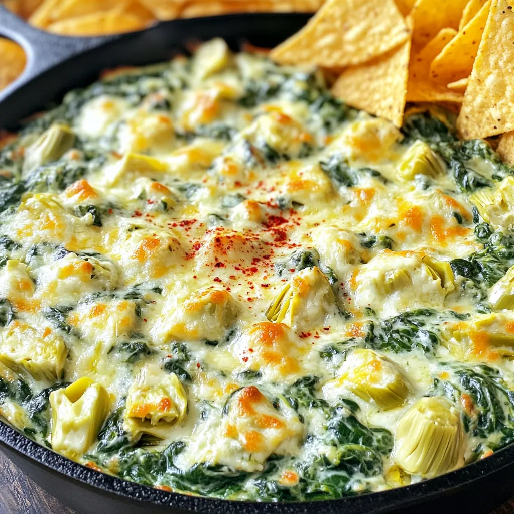 - 1 cup fresh spinach, chopped - 1 cup canned artichoke hearts, drained and chopped - 1 cup cream cheese, softened - 1 cup sour cream - 1 cup shredded mozzarella cheese - 1/2 cup grated Parmesan cheese - 1 clove garlic, minced - 1 teaspoon onion powder - 1 teaspoon red pepper flakes (optional for heat) - Salt and pepper to taste - 1 tablespoon olive oil - Tortilla chips or sliced baguette for serving This dip is all about fresh flavors and creamy goodness. Start with fresh spinach and canned artichoke hearts. They provide a great base for our dip. You can chop them up easily, making prep quick and simple. The cream cheese and sour cream bring rich creaminess. They blend well with the melted mozzarella and Parmesan cheese. This mix creates a dip that is smooth and cheesy, perfect for dipping. Garlic and onion powder add a nice depth of flavor. For those who love a bit of heat, red pepper flakes are a must. You can adjust the salt and pepper to your liking. Don't forget the olive oil! It helps sauté the garlic and keeps everything from sticking. For serving, grab some crispy tortilla chips or slices of baguette. They are the perfect vehicles for your dip. This list of ingredients makes your Cheesy Spinach Artichoke Dip Skillet taste amazing. Each one plays a key role in creating a dish you can’t resist. 1. First, heat 1 tablespoon of olive oil in a large skillet over medium heat. Add 1 clove of minced garlic and sauté it for about 1 minute until it smells great. The garlic adds a nice flavor to the dip. 2. Next, stir in 1 cup of chopped fresh spinach and 1 cup of canned artichoke hearts that you’ve drained and chopped. Cook this mixture for 2-3 minutes until the spinach wilts. This step gives the dip a fresh taste. 3. Now, lower the heat and add 1 cup of softened cream cheese, 1 cup of sour cream, 1 cup of shredded mozzarella cheese, and 1/2 cup of grated Parmesan cheese to the skillet. Stir continuously until the cheeses melt and everything becomes creamy. This is the heart of the dip! 4. After that, sprinkle in 1 teaspoon of onion powder and, if you like a bit of heat, add 1 teaspoon of red pepper flakes. Season with salt and pepper to taste. Mix until everything is smooth and creamy. 5. Once mixed, remove the skillet from the heat. Let it cool a bit before serving. - Serve the dip warm with tortilla chips or slices of baguette. Both options are great for dipping and add crunch. - For a lovely presentation, use a nice bowl for the dip. You can even garnish it with some extra cheese or a sprinkle of red pepper flakes. This makes it look more inviting and tasty! To get the perfect creamy texture, start with softened cream cheese. This helps it blend smoothly with the other cheeses. Stir continuously as you melt the cheese mix. This step ensures no clumps form. Avoid common mistakes by not overcooking the spinach. Cook it just until it wilts. Overcooking makes it soggy and takes away flavor. Also, don’t skip seasoning. A little salt and pepper can boost the taste. If you want to swap cheeses, try using cream or goat cheese. These add a nice twist to the flavor. You can also mix in cheddar for a sharper taste. If you don’t have fresh spinach, frozen spinach works well. Just thaw it and drain any extra water. This keeps the dip from becoming too watery. {{image_2}} You can make this cheesy spinach artichoke dip even better with some fun twists. Start by adding different spices and herbs. A pinch of smoked paprika or a dash of cayenne can add a nice kick. Fresh herbs like basil or parsley can brighten the flavor. You can also mix in proteins like cooked chicken or crispy bacon. Adding chicken makes it heartier, while bacon brings a savory crunch. If you're looking for a vegan version, swap the cream cheese and sour cream with plant-based alternatives. Use vegan mozzarella and Parmesan too. This way, you can enjoy the dip without dairy. For those who need gluten-free options, serve the dip with corn tortilla chips or sliced veggies. This way, everyone can join in on the fun! To save your cheesy spinach artichoke dip, place it in an airtight container. Make sure to cool it completely first. This dip lasts about 3 to 5 days in the fridge. If you want to enjoy it later, use the best storage practices to keep it fresh. You can reheat this dip in two main ways: using a microwave or an oven. For the microwave, place a portion in a safe bowl. Heat it in short bursts, about 30 seconds at a time, stirring in between. For the oven, preheat it to 350°F (175°C). Place the dip in an oven-safe dish and cover it with foil. Heat for about 15-20 minutes until it’s warm and bubbly. Enjoy your dip warm for the best taste! Can I make this dip ahead of time? Yes, you can prepare this dip in advance. Just make the dip and store it in the fridge. When you are ready to serve, heat it in a skillet until warm. This saves time during parties or gatherings. Is it possible to freeze Cheesy Spinach Artichoke Dip? You can freeze this dip, but it may change texture. Use an airtight container to avoid freezer burn. Thaw it in the fridge overnight, then reheat gently before serving. What are the best types of chips to serve with this dip? Tortilla chips work great with this dip. They add a nice crunch. You can also use sliced baguette for a different texture. Both choices complement the cheesy flavors well. Can I use fresh artichokes instead of canned? Yes, you can use fresh artichokes. Just cook them first until tender. Then chop them up and add them to the dip. Fresh artichokes can give a unique flavor to your dip. This Cheesy Spinach Artichoke Dip is easy to make and great to serve. You combine fresh spinach, artichokes, and several cheeses for a rich, tasty treat. Follow the steps for perfect results, and try the tips for extra flavor. Feel free to store your leftovers and reheat them easily. As you explore variations, you can customize this dip to match your taste. Whether for a party or a cozy night in, this
