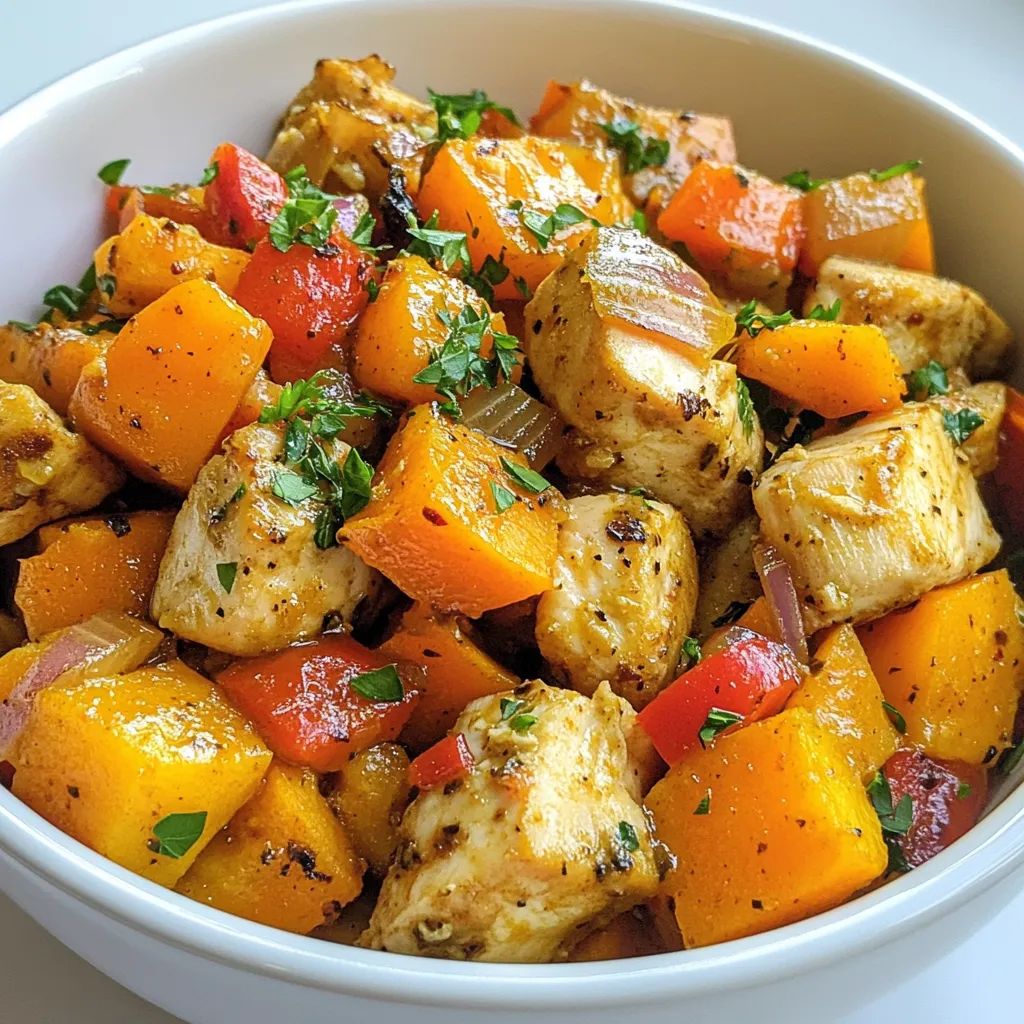 A delicious and hearty dish featuring diced chicken, sweet potatoes, and colorful vegetables, perfect for a comforting meal.