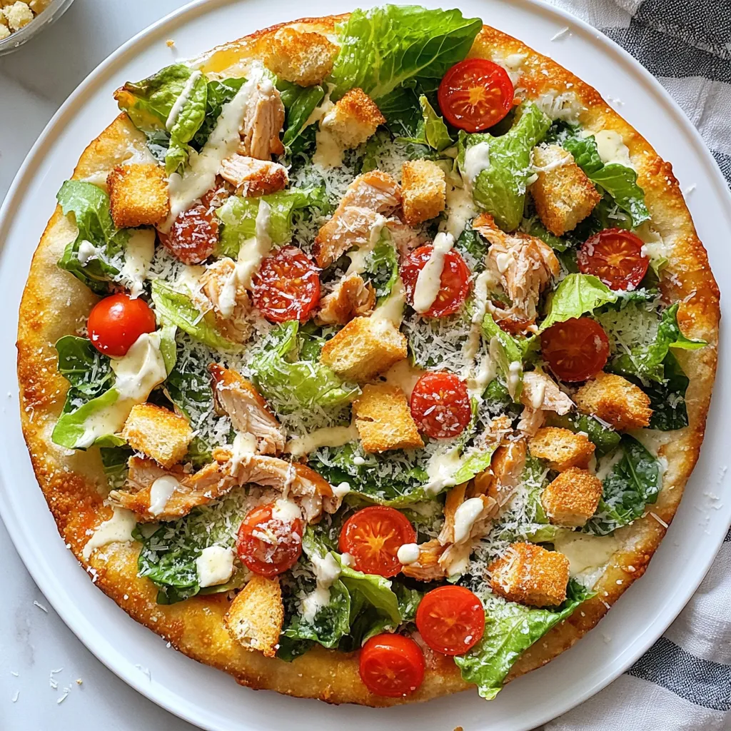 To make a tasty Chicken Caesar Salad Pizza, gather these key items: - 1 pre-made pizza crust (store-bought or homemade) - 1 cup cooked chicken breast, shredded - 1 cup romaine lettuce, chopped - 1/2 cup Caesar dressing - 1/2 cup cherry tomatoes, halved - 1/4 cup Parmesan cheese, grated - 1/4 cup croutons, crushed - 1 teaspoon garlic powder - 1 teaspoon olive oil - Salt and pepper to taste These ingredients come together to create a fresh and delicious pizza. The chicken gives protein, while the lettuce adds crunch. You can change up your Chicken Caesar Salad Pizza with these fun extras: - Bacon bits for extra flavor - Avocado slices for creaminess - Extra veggies like bell peppers or red onions - Different cheese types like mozzarella or feta These options let you personalize your pizza to fit your taste. Feel free to experiment! This recipe serves four and offers balanced nutrition. Here’s a quick look: - Calories per serving: about 350 - Protein: around 25 grams - Carbs: roughly 30 grams - Fat: about 15 grams This pizza provides a good mix of protein and healthy fats. Enjoy it as a meal or a fun snack! {{ingredient_image_1}} Start by preheating your oven to 425°F (220°C). If you use a pre-made crust, place it on a baking sheet or pizza stone. If you want to make your own crust, roll out the dough until it is round. Then, transfer it to your baking surface. This step sets the stage for a tasty pizza. Next, take one cup of cooked chicken breast and shred it. In a medium bowl, mix the chicken with one teaspoon of garlic powder, one teaspoon of olive oil, salt, and pepper to taste. Toss everything well to coat the chicken evenly. This will give your pizza a flavorful kick. Spread half a cup of Caesar dressing on the crust, leaving a small edge for the crust. Then, add the seasoned chicken on top. Follow with half a cup of halved cherry tomatoes and a sprinkle of one-fourth cup grated Parmesan cheese. Bake in the oven for 10-12 minutes. Look for a golden and crispy crust. While it bakes, toss one cup of chopped romaine lettuce with the remaining Caesar dressing. Once the pizza is done, let it cool for a minute. Top it with the dressed romaine and crushed croutons. Slice your pizza, serve, and enjoy! Using a pre-made crust saves time. Look for a thin crust for nice crunch. If you prefer homemade, make your dough the night before. Let it rise slowly in the fridge. This adds flavor and makes it easier to roll out. Roll it thin for a crispy bite. To get a crispy crust, preheat your oven well. Aim for 425°F (220°C). Baking on a pizza stone helps heat distribute evenly. If using a baking sheet, preheat it too. Brush the crust with olive oil before adding toppings. This adds flavor and helps it crisp up. Pair your Chicken Caesar Salad Pizza with a light salad. A simple green salad works well. You can also serve it with a glass of white wine. A crisp Sauvignon Blanc complements the flavors nicely. For a fun twist, offer a side of garlic dipping sauce. Pro Tips Use Fresh Ingredients: Fresh romaine lettuce and ripe cherry tomatoes will elevate the flavor of your pizza significantly. Experiment with Dressings: While Caesar dressing is classic, you can try variations like ranch or blue cheese for a different twist. Keep the Crust Crunchy: Bake your pizza on a pizza stone or preheated baking sheet for a crispier crust. Customize Your Toppings: Feel free to add other toppings like bacon bits or avocado to personalize your Chicken Caesar Salad Pizza. {{image_2}} To make a gluten-free version, choose a gluten-free pizza crust. Many stores offer this option. You can also make your own crust using almond flour or cauliflower. Just follow the same steps for topping, and enjoy! If you want a vegetarian pizza, swap the chicken for grilled vegetables. Bell peppers, zucchini, or mushrooms work well. You can also add chickpeas for protein. Just make sure to season them nicely before adding to the pizza. Try different dressings to change the flavor! A ranch or balsamic dressing can give a fun twist. For toppings, consider adding avocado slices or fresh basil. You can also use feta cheese instead of Parmesan for a unique taste. To keep your leftover pizza fresh, wrap it tightly in plastic wrap or foil. You can also place it in an airtight container. This helps prevent it from drying out. Store the pizza in the fridge for up to three days. If you want to keep it longer, consider freezing. When you’re ready to eat your pizza again, preheat your oven to 375°F (190°C). Place the pizza on a baking sheet. Heat it for about 10-15 minutes. This method keeps the crust crispy. If you’re in a hurry, you can use the microwave. Just know it may make the crust a bit soggy. You can freeze Chicken Caesar Salad Pizza for up to two months. To do this, slice the pizza first. Then, wrap each slice in plastic wrap. Place the wrapped slices in a freezer bag. When you're ready to eat, thaw them in the fridge overnight. After that, reheat as mentioned above for the best taste! Chicken Caesar Salad Pizza is a fun twist on the classic salad. It combines fresh flavors with pizza. You start with a pizza crust. Then, you add shredded chicken, romaine lettuce, and Caesar dressing. Cherry tomatoes and Parmesan cheese top it off. The result is a tasty pizza that tastes like a salad. Yes, you can use different meats. Grilled chicken works great. You can also try turkey or shrimp. Each meat gives a unique flavor. Just make sure it is cooked before adding it to the pizza. Many pizza shops and casual dining places offer this dish. Look for places that specialize in creative pizzas. Some Italian restaurants may also have it. You can ask your favorite local restaurant if they can make it. To make this pizza ahead of time, prepare the crust and toppings. Store the cooked chicken and dressing in separate containers. You can assemble the pizza later. Just bake it before serving. This way, you enjoy fresh pizza without all the work at once. In t
