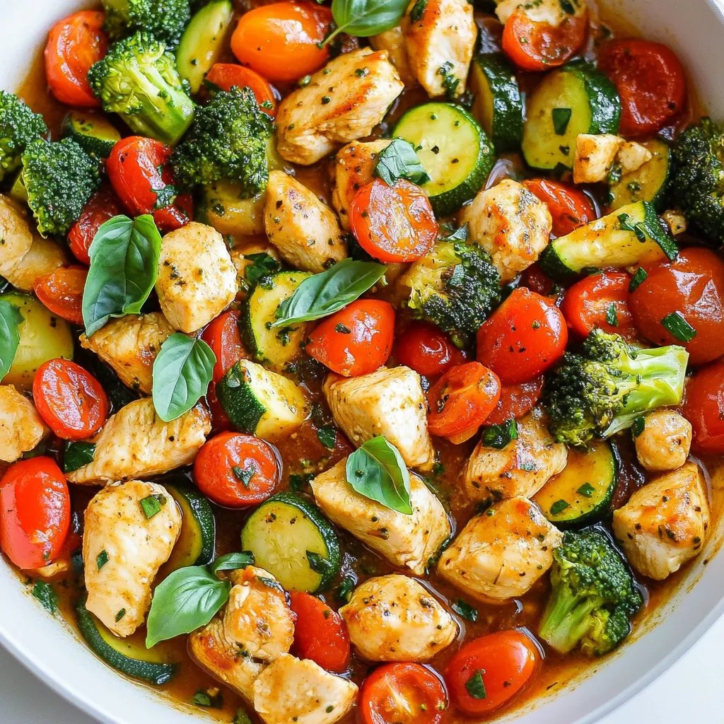 A colorful and healthy skillet dish featuring chicken and fresh vegetables, perfect for a quick weeknight dinner.