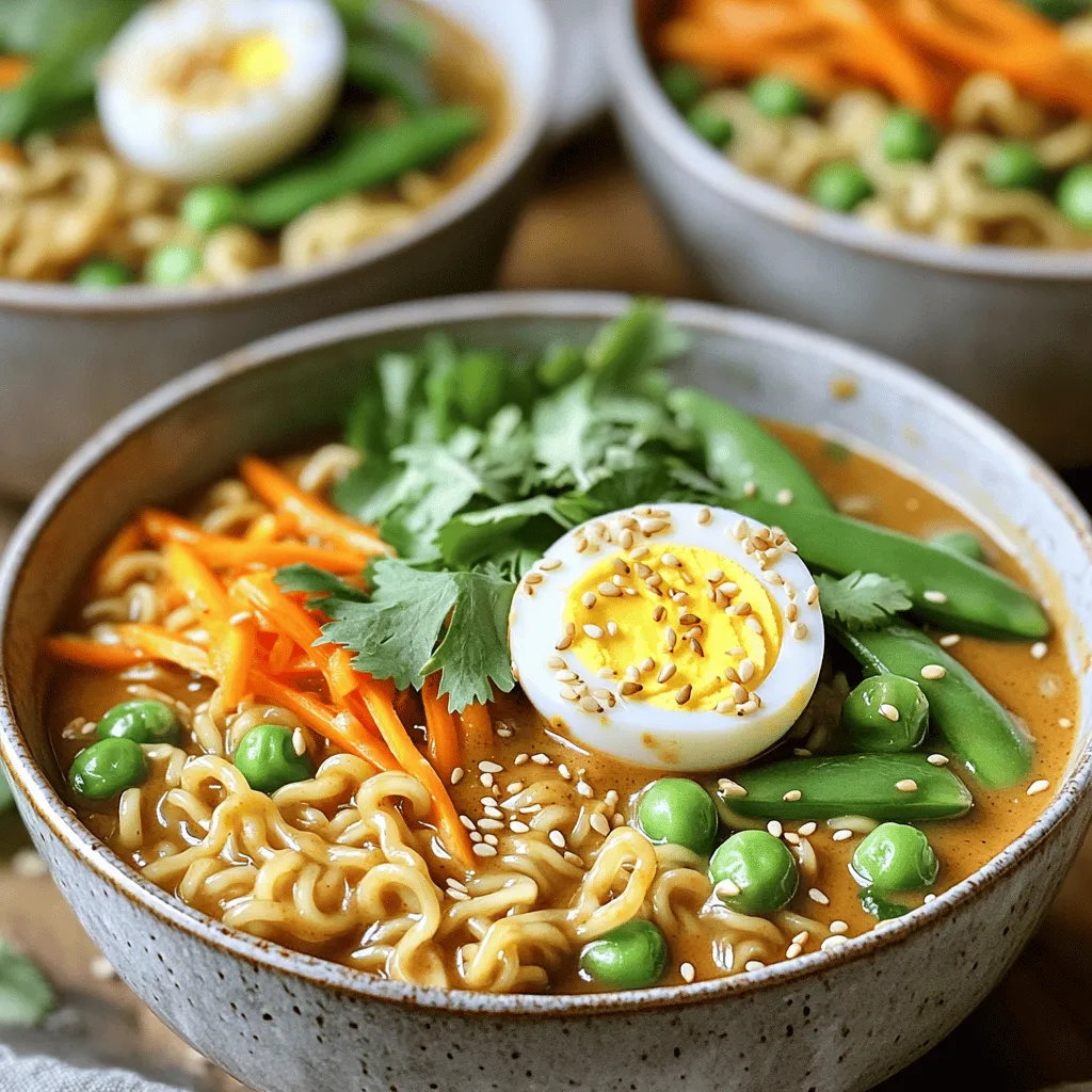 For the final assembly, add the cooked ramen noodles to the pan with the sautéed vegetables. Pour the peanut butter sauce over the noodles. Toss everything together gently until the noodles are fully coated in sauce. This step combines all the flavors into one delicious dish. Once mixed well, divide the ramen into bowls. If you like, top each bowl with a halved boiled egg, a sprinkle of toasted sesame seeds, and some fresh cilantro. Enjoy your tasty and quick meal!