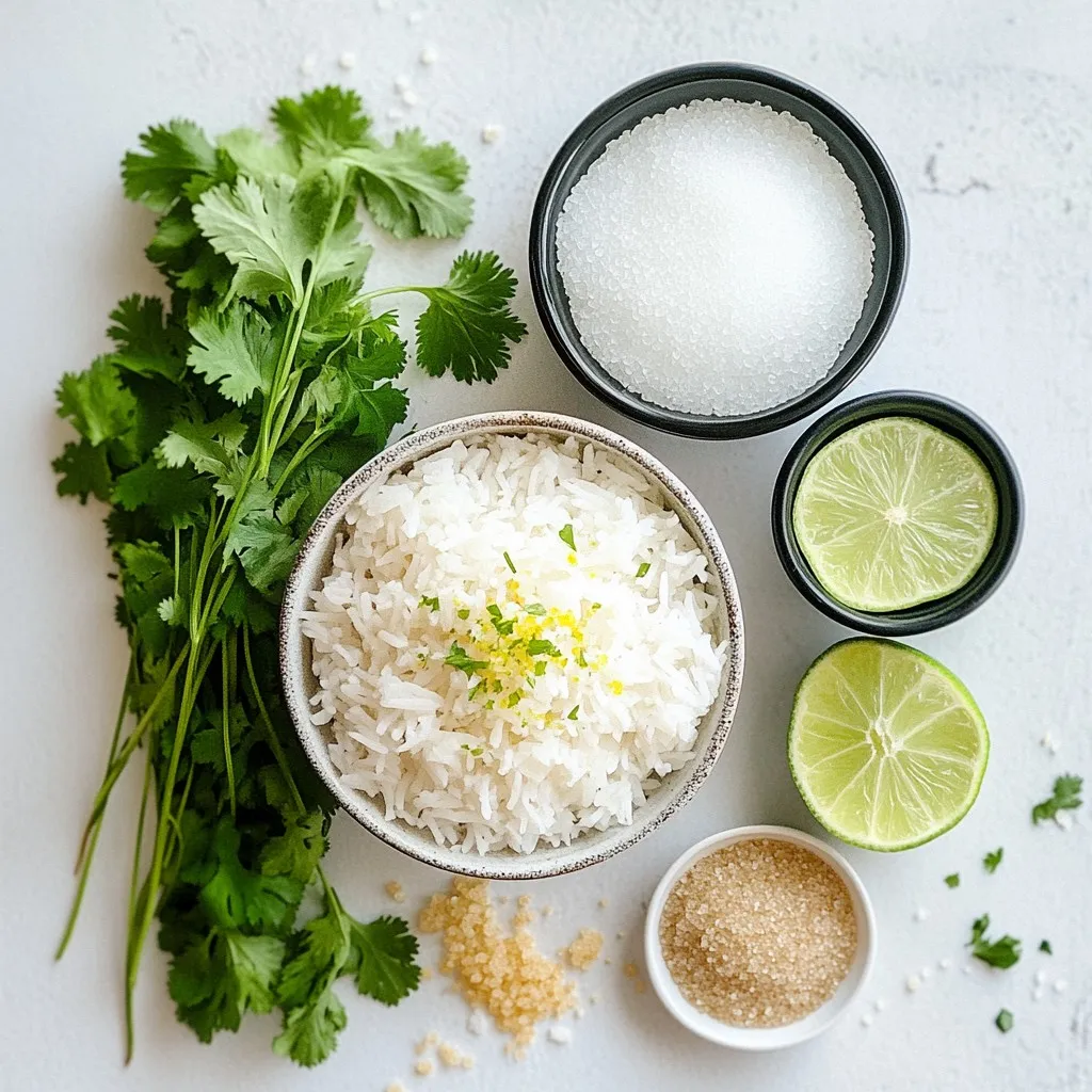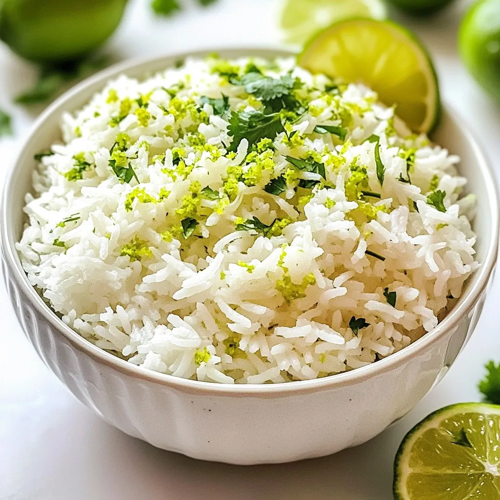 - 1 cup jasmine rice - 1 cup coconut milk - Zest of 1 lime - 2 tablespoons fresh lime juice Jasmine rice is key in this dish. It brings a soft, fragrant flavor. Coconut milk adds creaminess and a hint of sweetness. Lime zest and juice give the rice a bright, tangy kick. - 1 tablespoon brown sugar - 1/2 teaspoon salt - Fresh cilantro, for garnish Brown sugar balances the dish's flavors. Salt enhances everything, making the rice taste good. Fresh cilantro adds a pop of color and freshness. - Lime wedges - Pairings with proteins or vegetables Serve with lime wedges for extra zest. This dish pairs well with grilled chicken, shrimp, or roasted veggies. The flavors mix perfectly, making every bite exciting. {{ingredient_image_1}} To start, rinse the jasmine rice. Place it in a fine mesh strainer. Run cold water over it until the water runs clear. This step removes excess starch and helps the rice cook better. Drain the rice well after rinsing. Next, grab a medium saucepan. Combine the following ingredients in the saucepan: - 1 cup coconut milk - 1/2 cup water - Zest of 1 lime - 2 tablespoons fresh lime juice - 1 tablespoon brown sugar - 1/2 teaspoon salt Mix them well. This mixture gives the rice a rich flavor. Now, bring the mixture to a gentle boil over medium heat. Watch closely to ensure it doesn’t boil too hard. Once it boils, stir in the rinsed jasmine rice. Reduce the heat to low. Cover the pan tightly with a lid. Let it simmer for about 15 to 18 minutes. The rice should become tender, and the liquid will be absorbed. After cooking, remove the saucepan from heat. Keep the lid on and let the rice sit for about 5 minutes. This steaming helps make the rice fluffy. After 5 minutes, uncover the pan. Fluff the rice gently with a fork. This step separates the grains and enhances the texture. Taste the rice. You can adjust the seasoning at this point. If you want more flavor, add a little more salt or lime juice. Finally, garnish your coconut lime rice with freshly chopped cilantro. Serve it with lime wedges on the side for an extra burst of flavor. Enjoy your delicious side dish! Rinsing your rice is key. It helps remove extra starch. This gives you fluffy rice, not sticky. Rinse the jasmine rice under cold water. Keep rinsing until the water runs clear. Drain it well before cooking. Letting the rice rest is also important. After cooking, let it sit covered for about five minutes. This steaming time helps make the rice light and fluffy. Don't skip this step! Use fresh ingredients for the best taste. Fresh lime juice and zest brightens the dish. You can also add fresh cilantro as a garnish. It adds color and flavor. If you want extra zing, try other citrus fruits. Lemon or orange zest works well too. These can give your rice a unique twist. One common mistake is cooking the rice too fast. Make sure to keep the heat low after it boils. This allows the rice to cook evenly. Another mistake is not covering the pot properly. A tight lid keeps steam in, which is crucial for cooking. If steam escapes, your rice may turn out dry. Pro Tips Rinse the Rice: Rinsing the jasmine rice before cooking helps to remove excess starch, preventing it from becoming too sticky and ensuring a fluffy texture. Adjusting Sweetness: The brown sugar adds a subtle sweetness to the dish. Feel free to adjust the amount based on your preference for sweetness or omit it entirely for a more savory flavor. Let It Steam: Allowing the rice to sit covered for an additional 5 minutes after cooking helps to steam the rice and enhances its fluffiness. Fresh Garnish: Adding fresh cilantro just before serving not only adds a pop of color but also brightens the flavors of the coconut lime rice. Experiment with other herbs like mint for a different twist. {{image_2}} You can switch up the rice in this recipe. Try basmati rice for a nutty taste. Brown rice is another great option. It adds fiber and a hearty feel. Just remember, cooking times will change. Use the package instructions for best results. You can also change the liquid. If you want a lighter taste, use almond milk. Vegetable broth can add depth too. Each swap gives a twist to the dish. Want to amp up the flavor? Consider adding spices. Cardamom brings warmth, while ginger adds a nice kick. Just a pinch can change the whole dish. You can also mix in vegetables. Peas add sweetness and color. Bell peppers give crunch and a fresh taste. These additions make your rice more colorful and fun. Coconut Lime Rice works well as a base. Serve it under stir-fry or curry. The rice absorbs the tasty sauce. This makes every bite delightful. You can also turn it into a salad. Mix in fresh greens and a splash of lime juice. This twist makes a light and zesty dish. Enjoy the bright flavors and textures! To store coconut lime rice, let it cool first. Place it in a clean, airtight container. Glass or BPA-free plastic containers work best. Seal the container tightly to keep moisture out. This method helps maintain the rice's flavor and texture. When reheating coconut lime rice, use the stovetop or microwave. For stovetop, add a splash of coconut milk or water. Stir gently over low heat until warm. In the microwave, cover the bowl with a damp paper towel. This keeps the rice moist. You can also squeeze fresh lime juice on top for extra flavor. Coconut lime rice lasts about 4 to 5 days in the fridge. For longer storage, freeze it in an airtight container. It can last up to 3 months in the freezer. Before using, check for signs of spoilage. If it smells sour or shows mold, it’s best to toss it out. To make coconut lime rice extra creamy, use more coconut milk. Instead of one cup, try one and a half cups. This change gives the rice a rich texture. You can also add a bit of butter or cream for a buttery flavor. Yes, you can make this dish ahead of time. Cook the rice and let it cool. Then, store it in a sealed container in the fridge. When ready to serve, reheat it on the stove or in the microwave. Ad