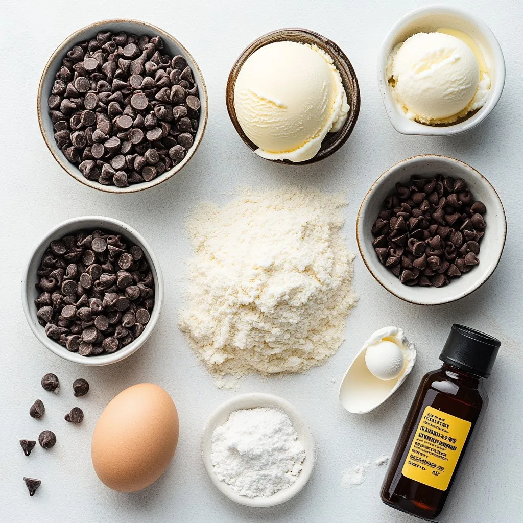 Eggs bring structure and help the cookies rise. All-purpose flour is the base for your cookies. Baking soda helps them spread and rise. Salt balances the sweetness. Semi-sweet chocolate chips give a nice melt and contrast. Finally, vanilla ice cream adds a cool, creamy layer.