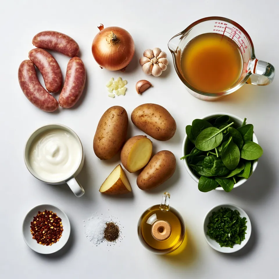 Start by gathering all your ingredients. You will need Italian sausage, onion, garlic, chicken broth, potatoes, heavy cream, spinach, and seasonings. Make sure to have a large pot ready. This will help everything cook evenly and blend well. Dice your onion and potatoes into small pieces. Mince your garlic cloves. This prep makes cooking easier and faster.