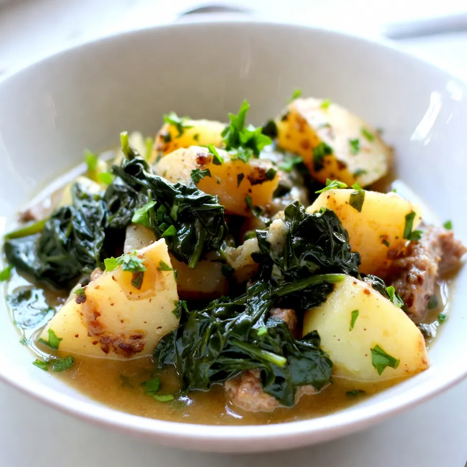 A hearty soup featuring Italian sausage, potatoes, and fresh spinach in a creamy broth.