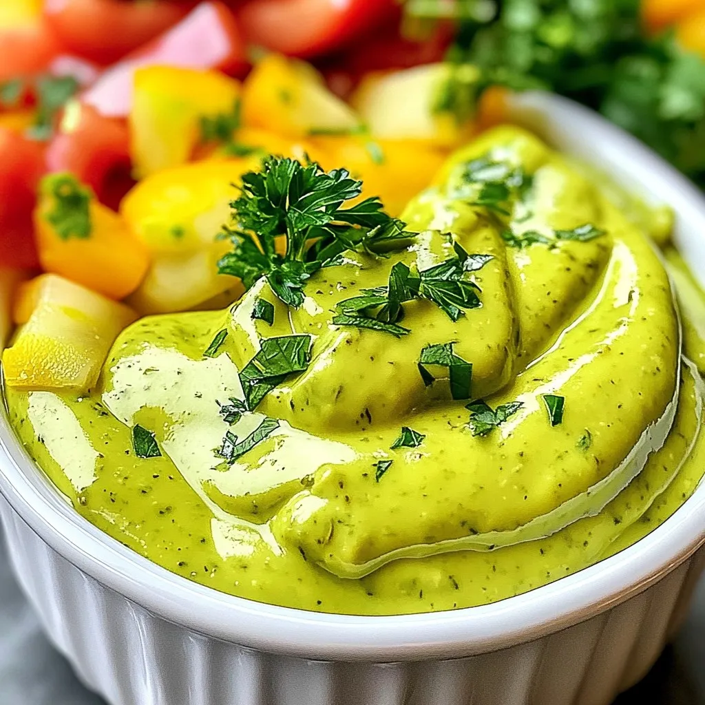 A rich and creamy dressing made with ripe avocado and flavorful herbs, perfect for salads or as a dip.