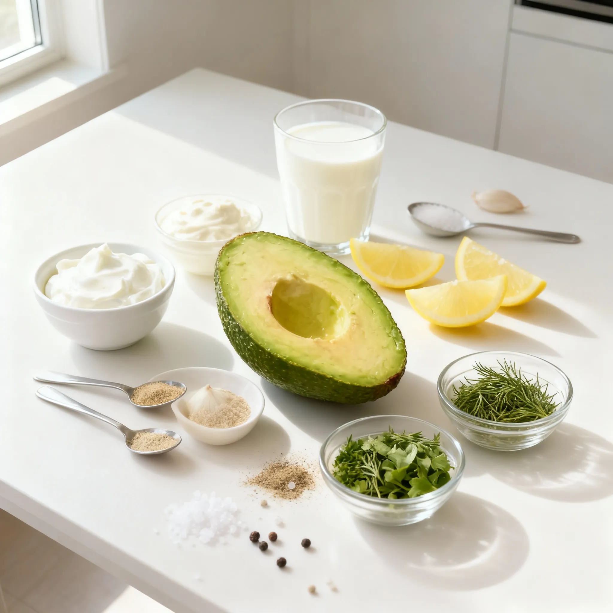 To make creamy avocado ranch dressing, gather these simple ingredients: