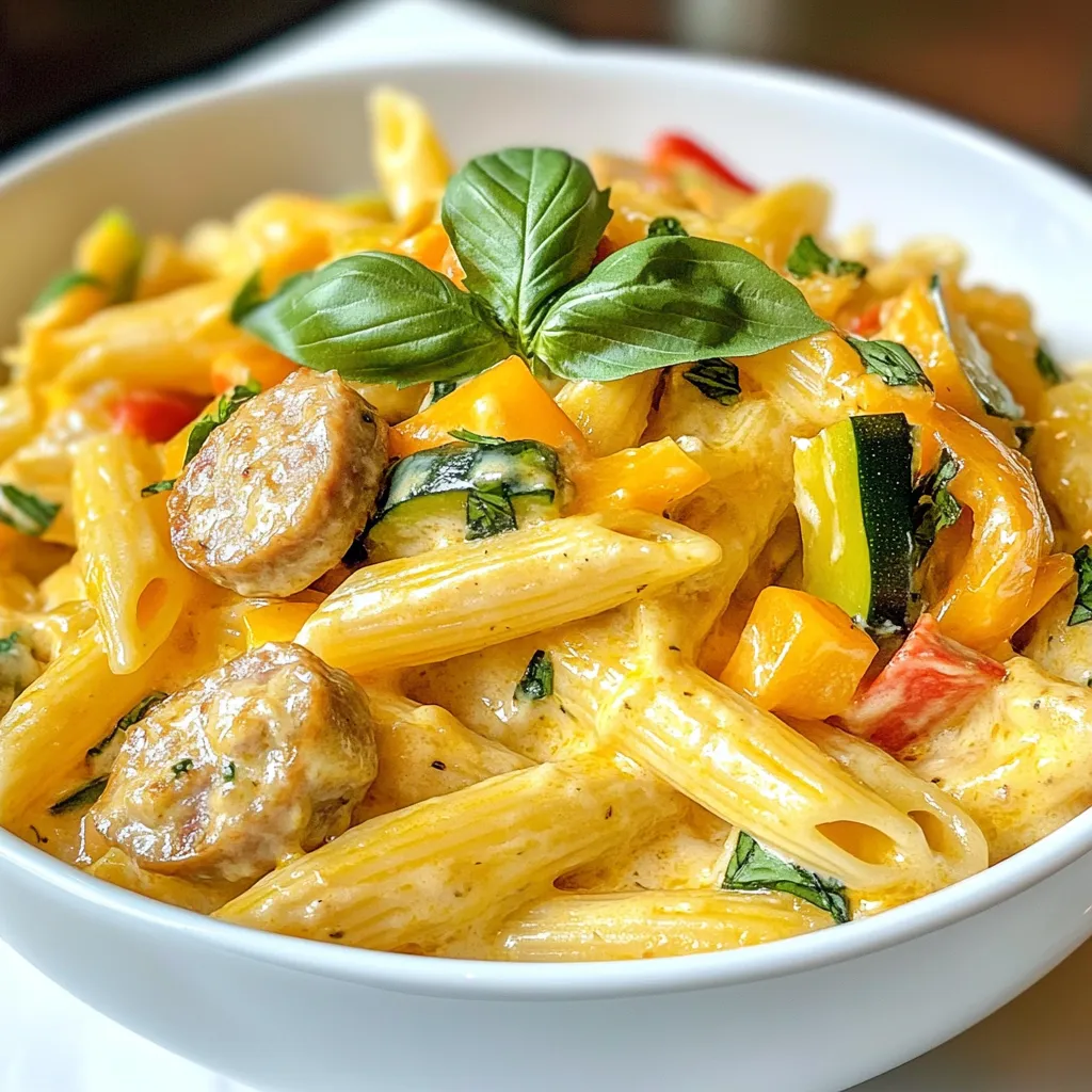 A creamy and flavorful pasta dish featuring chicken sausage and fresh vegetables.