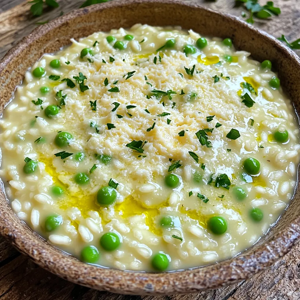Start by gathering your ingredients. You will need Arborio rice, vegetable broth, onion, garlic, peas, Parmesan cheese, olive oil, butter, salt, and pepper.