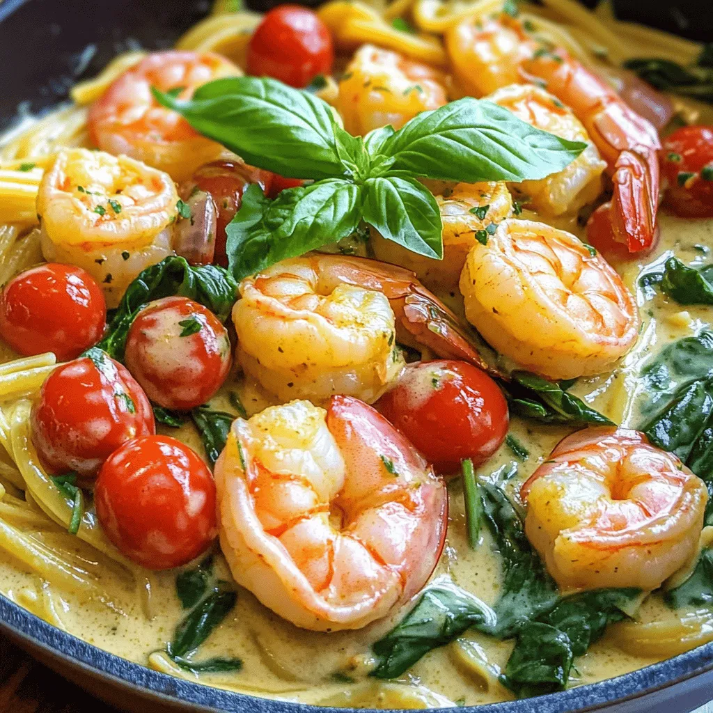 Fresh basil leaves are perfect for garnishing. They brighten the dish with flavor and color. Finally, serve your creamy Tuscan shrimp over cooked pasta or rice. This makes for a satisfying meal.