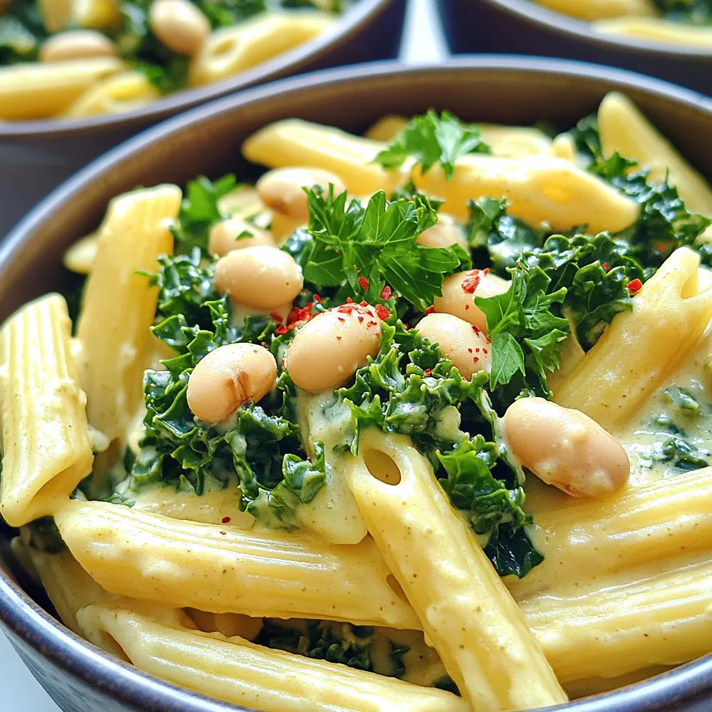 For this dish, I love using penne or fusilli pasta. Both types hold the sauce well. White beans add protein and creaminess. I often choose cannellini beans for their smooth texture. Chopped kale brings color and nutrients.