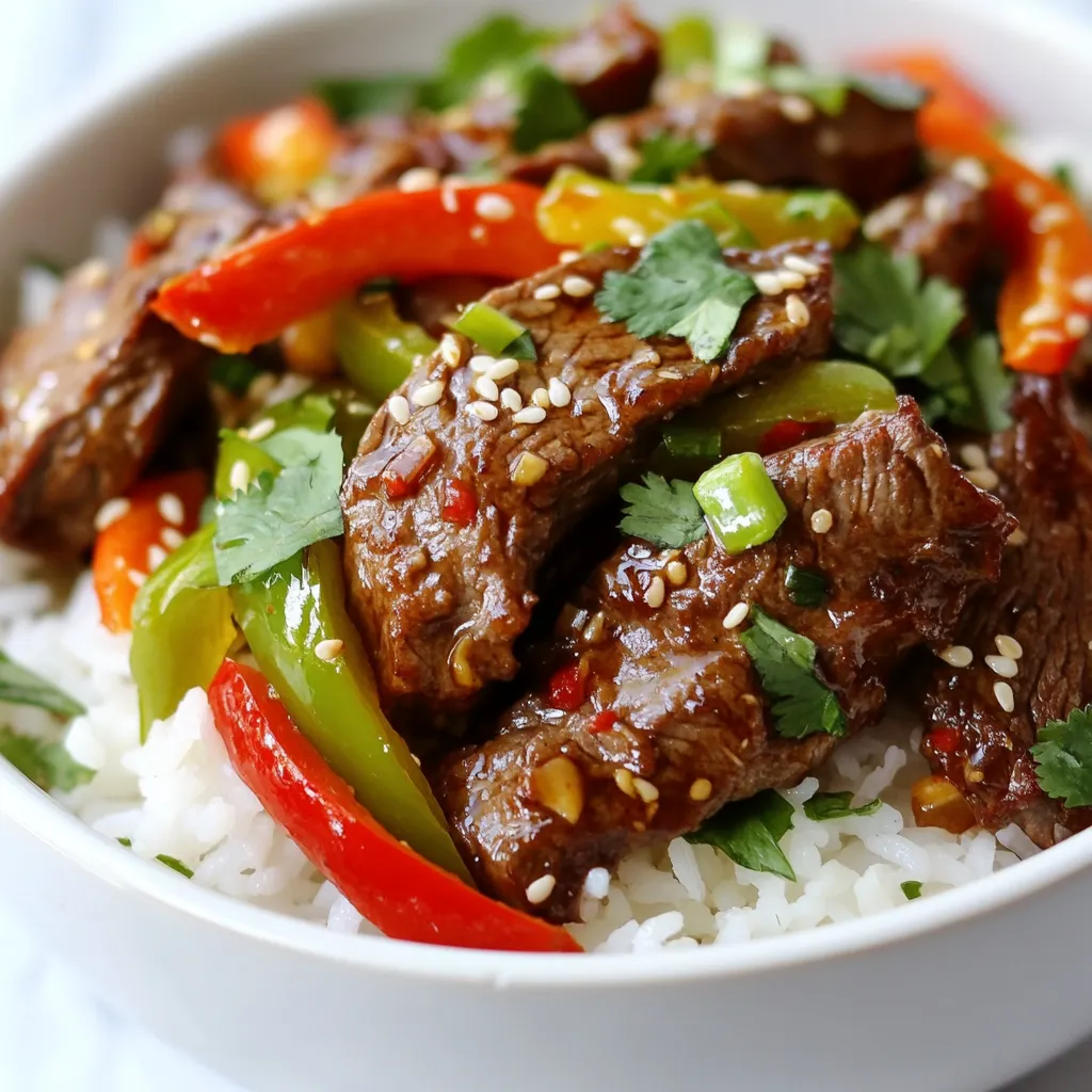 A delicious stir-fry featuring crispy beef, colorful bell peppers, and fragrant jasmine rice.