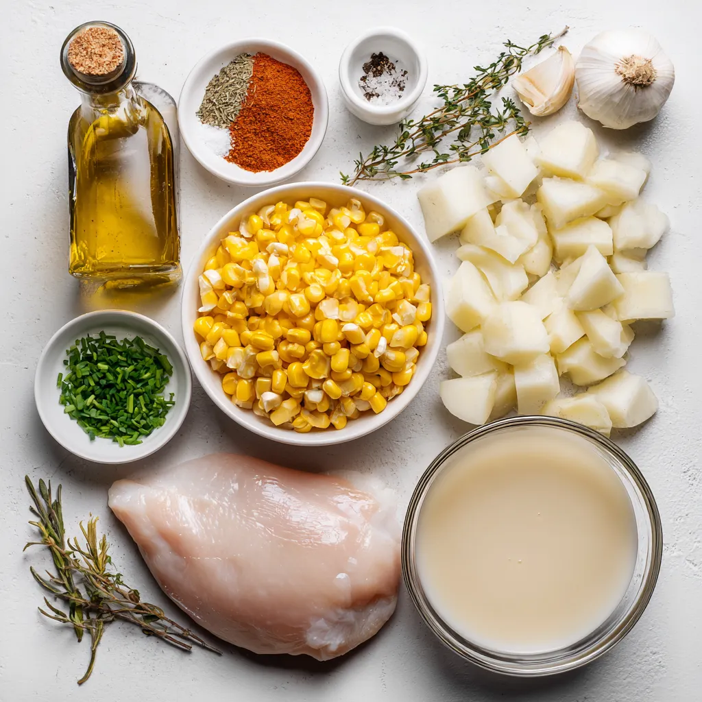 For this chowder, the main ingredients are simple but full of flavor. The chicken breasts add protein and a nice bite. Corn brings sweetness and a hint of crunch. Potatoes make the chowder hearty and filling. Onion and garlic give a warm base for the dish.