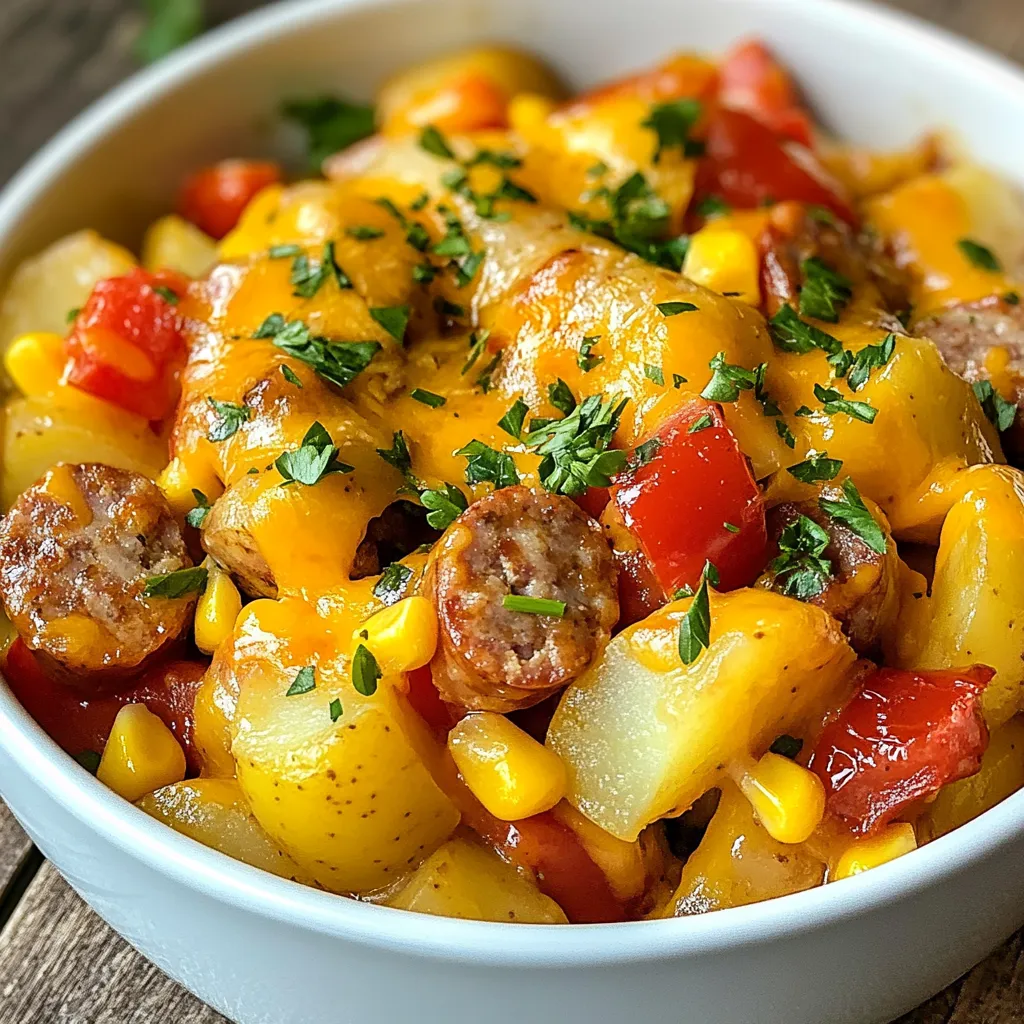 A hearty and flavorful casserole made with Italian sausage, bell peppers, potatoes, and topped with melted cheddar cheese.