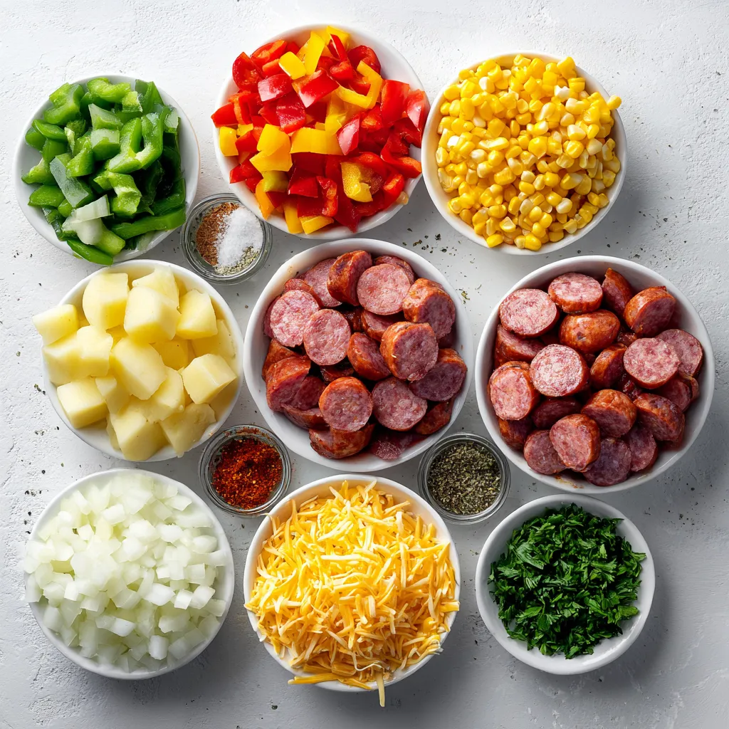 Use 1 cup of diced bell peppers. A mix of red, green, and yellow adds great color. Also, chop 1 medium onion and mince 2 cloves of garlic. Add 3 cups of diced potatoes, like Yukon gold or red. Lastly, include 1 cup of frozen corn for sweetness.