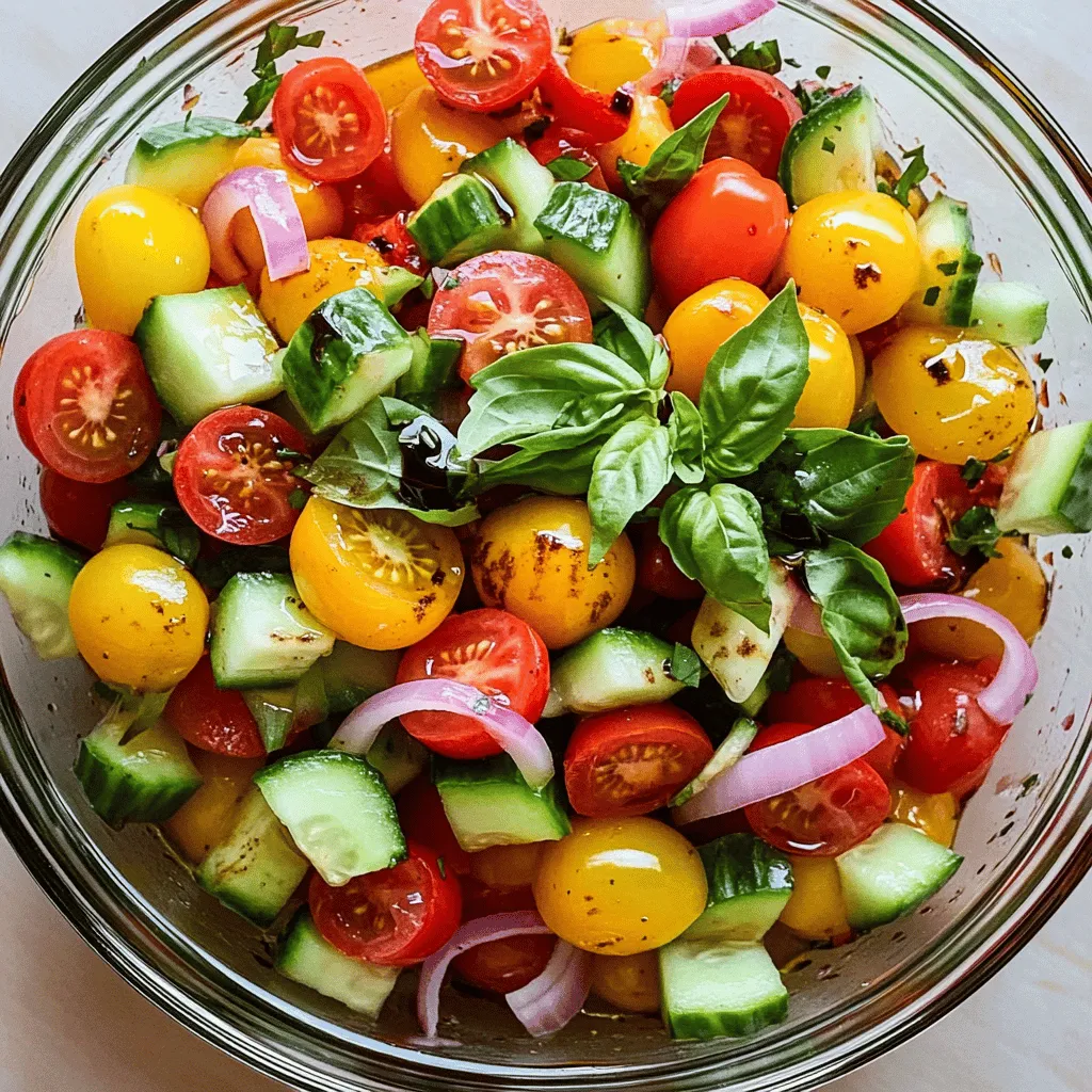 To start, fresh ingredients are key. Cherry tomatoes add a sweet pop. Cucumber gives a nice crunch. Red onion adds a mild bite, while basil brings a hint of freshness. Using ripe tomatoes makes a big difference in taste.