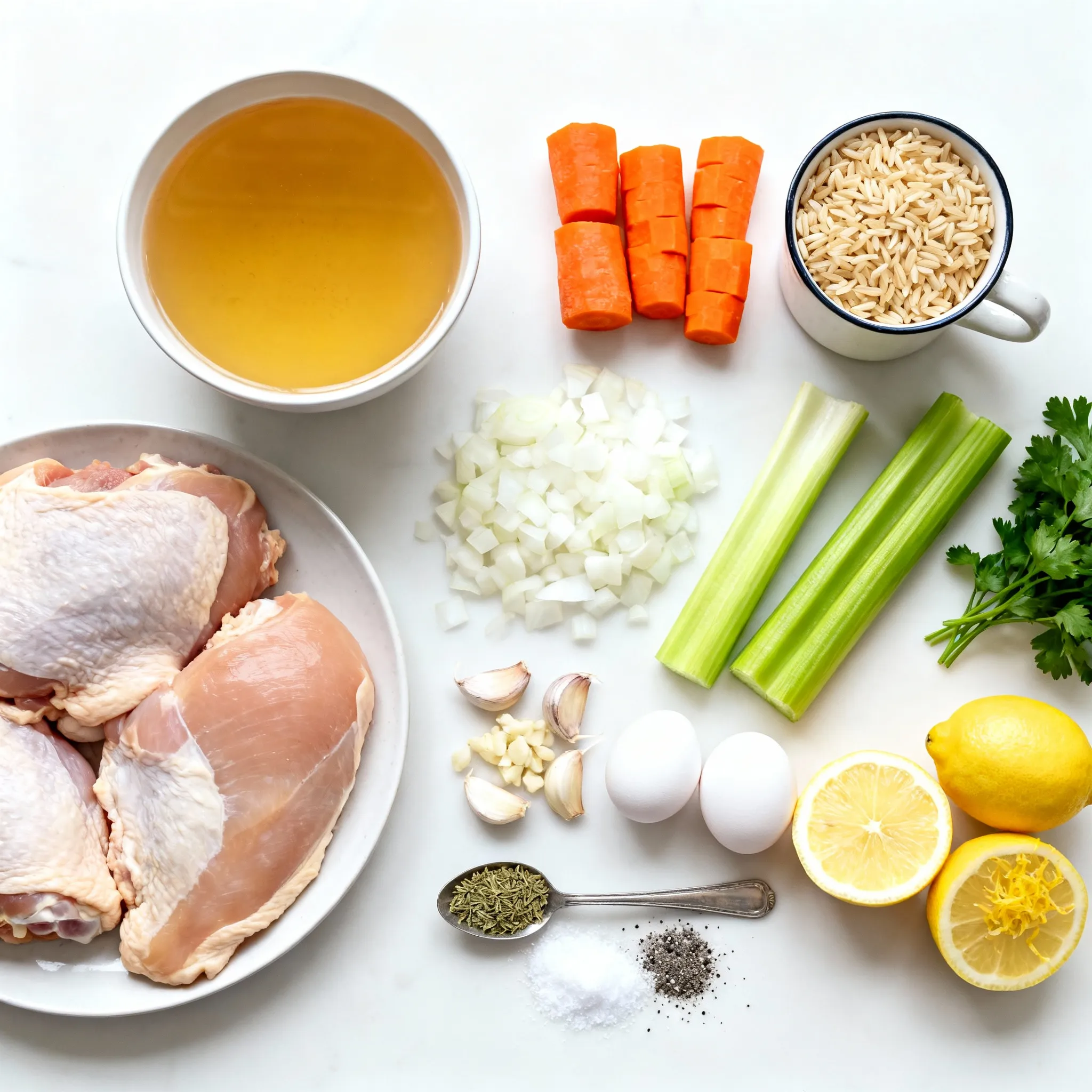 To make Greek lemon chicken soup, start by gathering all your ingredients. You will need chicken broth, chicken thighs, diced carrots, diced celery, chopped onion, and minced garlic.