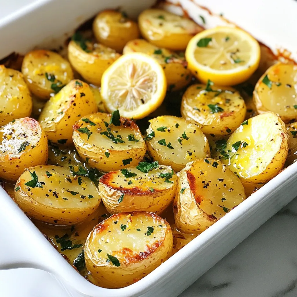 A flavorful dish of baby Yukon gold potatoes roasted with lemon, garlic, and herbs.