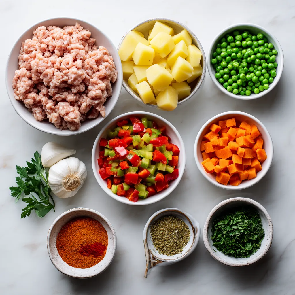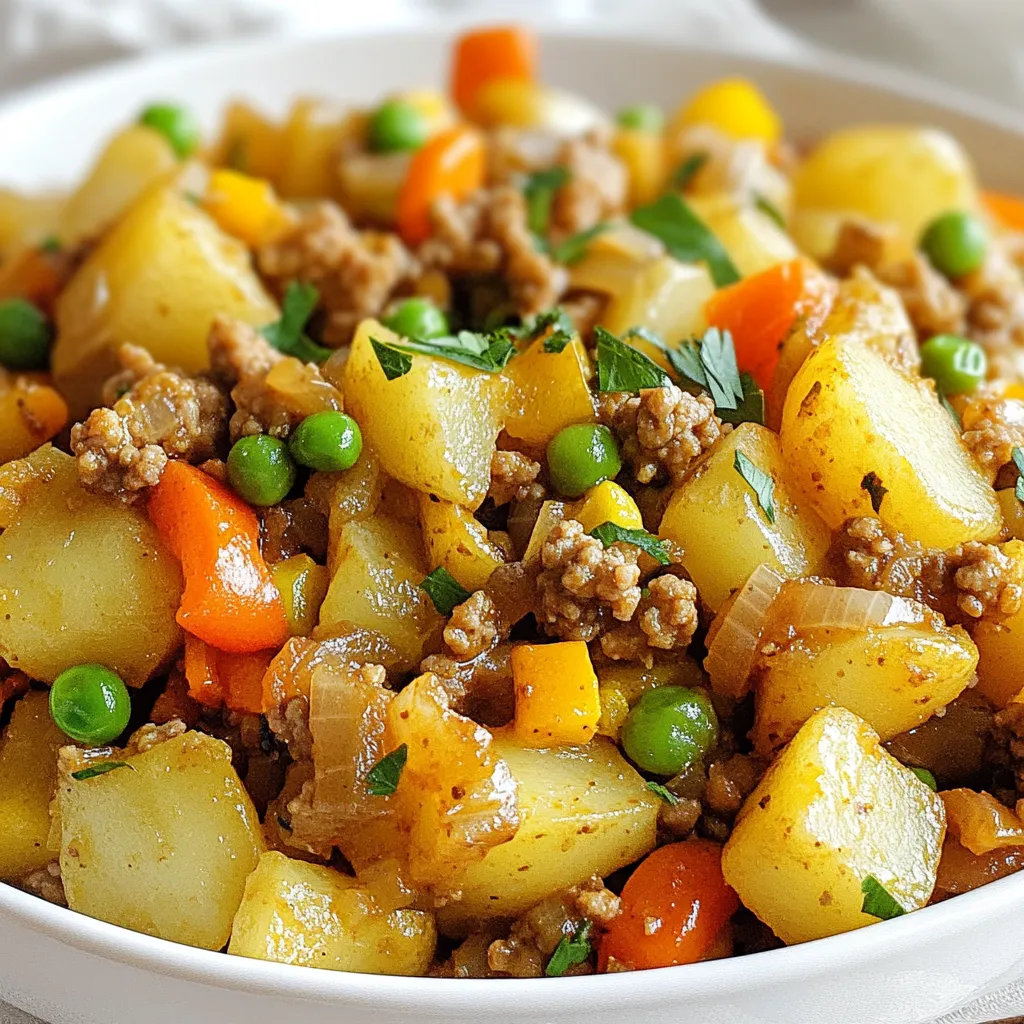 To make the Ground Turkey Potato Skillet, gather these items: - 1 lb ground turkey - 4 medium potatoes, diced - 1 small onion, finely chopped - 2 cloves garlic, minced - 1 bell pepper (any color), diced - 1 cup frozen peas and carrots - 1 teaspoon paprika - 1 teaspoon dried oregano - 1 teaspoon cumin - 2 tablespoons olive oil - Salt and pepper to taste - Fresh parsley, chopped for garnish You can swap ingredients if needed. Here are some ideas: - Use chicken instead of ground turkey for a lighter option. - Sweet potatoes work well in place of regular potatoes. - Any onion type can be used; yellow, red, or green onions all taste great. - You can replace bell peppers with zucchini or mushrooms. - Fresh herbs can replace dried ones. Use three times more fresh herbs for flavor. This dish is not only tasty but also healthy. Here’s a rough breakdown per serving: - Calories: 350 - Protein: 25g - Carbohydrates: 40g - Fat: 12g - Fiber: 5g - Sugar: 3g This meal offers a good balance of protein, carbs, and fats. It's filling and packed with nutrients from the veggies. {{ingredient_image_1}} First, you want to heat 2 tablespoons of olive oil in a large skillet. Use medium heat for best results. Next, add 4 medium potatoes, diced into small cubes. Cook the potatoes for about 10 minutes. Stir them occasionally to get them golden and slightly crispy. You want them to be tender but not mushy. This will give your dish a nice texture. Once your potatoes are golden, it’s time to add flavor. Toss in 1 small onion, finely chopped, and 1 diced bell pepper of any color. Sauté these for about 5 minutes. You want the onions to turn translucent and the peppers to soften. This step builds a great base for your meal. After that, push the veggies to one side of the skillet. Add 2 cloves of minced garlic to the empty space. Sauté the garlic for 1 minute. You will smell a lovely aroma! This brings out the garlic's flavor without burning it. Now, it’s time to add the star of this dish: 1 pound of ground turkey. Break it up with a spatula as you add it to the skillet. Cook for about 5 to 7 minutes. You want the turkey to brown nicely. Stir it well with the veggies. Once the turkey is browned, it’s time to add your spices. Mix in 1 teaspoon of paprika, 1 teaspoon of dried oregano, and 1 teaspoon of cumin. Add salt and pepper to taste. Mix everything well. This will coat the turkey and veggies with flavor. Lastly, stir in 1 cup of frozen peas and carrots. Mix them in and cook for an additional 3 to 5 minutes. This will heat everything through. Taste your dish and adjust the seasoning if needed. You want it to be just right. When finished, remove the skillet from heat and garnish with fresh chopped parsley. Enjoy your tasty and quick meal! To get crispy potatoes, start with diced potatoes. Choose medium-sized ones. Soak them in cold water for about 15 minutes. This helps remove extra starch. After soaking, drain and dry them well. Heat olive oil in your skillet over medium heat. Spread the potatoes in a single layer. Let them cook without stirring for about 10 minutes. This way, they get that golden crust. Stir them gently and cook until they are crispy. To change the flavor, try different spices. You can add chili powder for heat. Italian seasoning can give it a nice twist. For a smoky taste, use smoked paprika. You can also mix in fresh herbs like thyme or rosemary. Just toss in the spices when you add the ground turkey. This helps the flavors blend well. For even cooking, cut your ingredients into similar sizes. This helps them cook at the same rate. Stir the mixture often, especially when adding the ground turkey. Break it up well with a spatula while it cooks. This prevents big clumps. If you add frozen veggies, let them thaw slightly first. This speeds up cooking time and helps avoid sogginess. Pro Tips Choose the Right Potatoes: For a crispier texture, use waxy potatoes like Yukon Gold or red potatoes, which hold their shape better during cooking. Season in Layers: To enhance flavor, season each component as you add it to the skillet rather than all at once, allowing the spices to develop. Prep Ahead: Dice your vegetables and measure out spices before starting to cook; this makes the cooking process smoother and quicker. Add Freshness: Consider adding a squeeze of lemon juice or a splash of vinegar at the end for brightness that complements the savory flavors. {{image_2}} You can swap the ground turkey for many other proteins. Ground chicken is a great choice. It has a mild flavor similar to turkey. If you want something richer, try ground beef. It adds a hearty taste and pairs well with potatoes. For a lighter option, use ground chicken breast. If you prefer plant-based meals, try crumbled tofu or lentils. Both options provide protein and absorb flavors well. Feel free to add more veggies to your skillet. Zucchini works well; it cooks quickly and adds moisture. Spinach is another great option. It wilts nicely and boosts nutrition. Carrots can add a sweet crunch if you want more texture. Broccoli florets also fit in well. They add a nice bite and can absorb flavors. Just remember to cut them small for even cooking. Your seasoning choices can change the whole dish. If you love heat, add chili powder or cayenne pepper. For a fresh taste, try adding basil or thyme. You can also use taco seasoning for a fun twist. It brings bold flavors and pairs well with the meat and potatoes. For an Asian twist, use soy sauce and ginger. Each blend can create a unique meal experience. Storing leftovers is simple. Allow the skillet meal to cool down first. Then, place it in an airtight container. You can keep it in the fridge for up to three days. Make sure to label the container with the date. This helps you track how long it has been stored. Reheating is easy and quick. You can use a microwave or a skillet. For the microwave, place your portion in a bowl. Cover it with a damp paper towel to keep it moist. Heat for about 1-