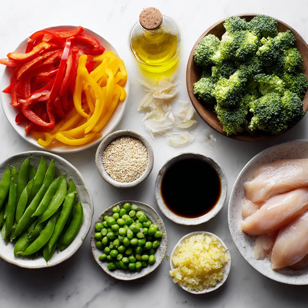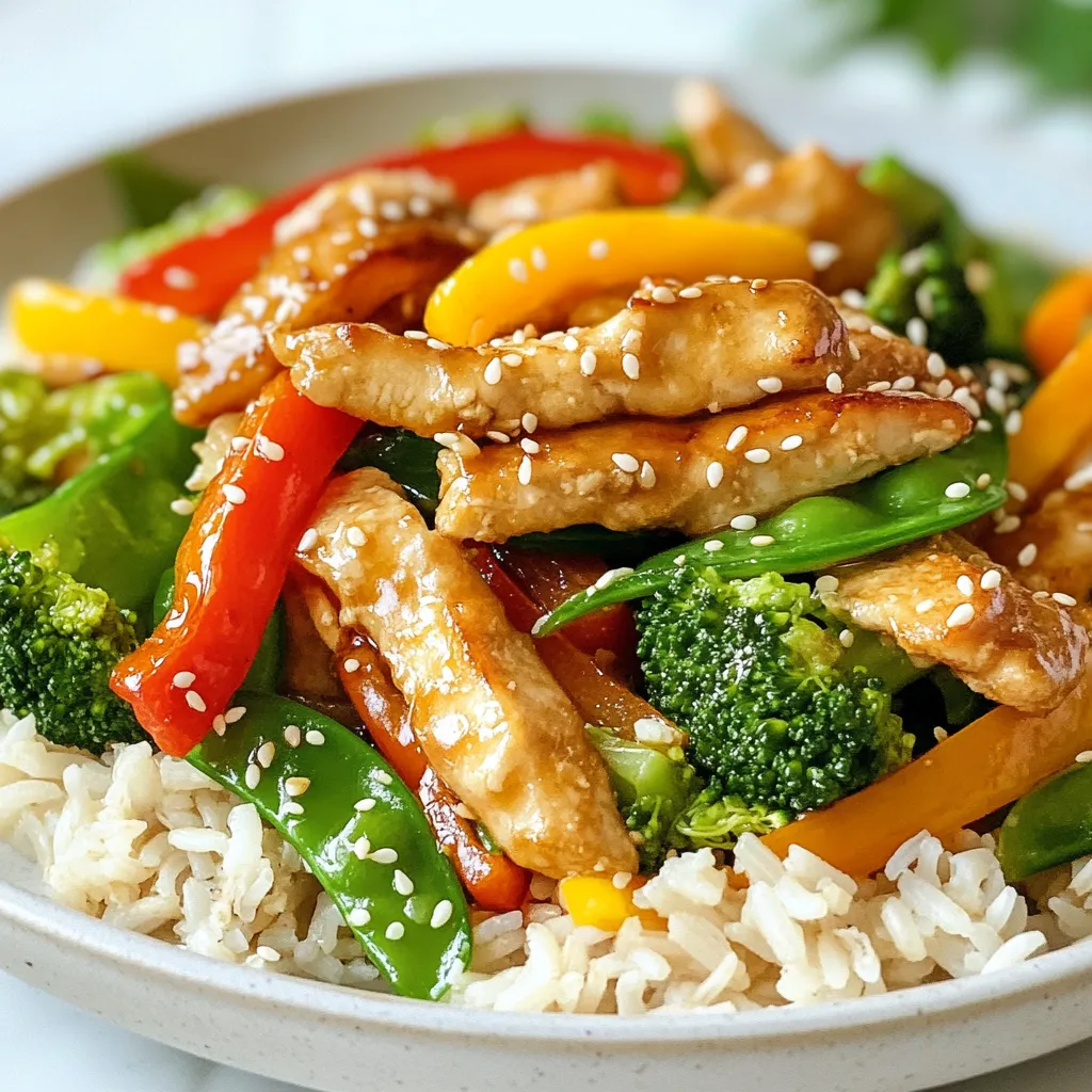 To make a tasty Healthy Chicken Veggie Stir Fry, gather these fresh ingredients: - 2 boneless, skinless chicken breasts, sliced thinly - 2 tablespoons olive oil - 1 red bell pepper, sliced - 1 yellow bell pepper, sliced - 1 cup broccoli florets - 1 cup sugar snap peas - 3 cloves garlic, minced - 1 tablespoon fresh ginger, grated - 2 tablespoons low-sodium soy sauce - 1 tablespoon sesame oil - Salt and pepper to taste - 1 teaspoon sesame seeds (for garnish) - Cooked brown rice or quinoa for serving This stir fry offers a balanced meal packed with nutrients. Each serving provides: - Protein from chicken, helping to build and repair tissue. - Fiber from veggies, aiding in digestion and keeping you full. - Healthy fats from olive oil and sesame oil, good for heart health. - Vitamins and minerals from colorful vegetables, boosting your immune system. To keep your ingredients fresh, follow these simple tips: - Choose vibrant, firm vegetables. Look for smooth skin on peppers and bright green broccoli. - Store fresh chicken in the coldest part of your fridge. Use within two days for best taste. - Buy garlic and ginger that feel firm and smell strong. This ensures great flavor in your dish. - If you can, buy organic vegetables. They often have better taste and no harmful chemicals. By using fresh ingredients, you'll create a stir fry that is not only healthy but also bursting with flavor! {{ingredient_image_1}} 1. Gather your ingredients. You need chicken breasts, bell peppers, broccoli, sugar snap peas, garlic, ginger, soy sauce, sesame oil, and olive oil. 2. Slice the chicken. Cut the chicken breasts into thin strips. This helps them cook fast. 3. Chop the veggies. Slice red and yellow bell peppers. Break the broccoli into small florets. This makes them easy to eat. 4. Mince garlic and grate ginger. These add great flavor. Prepare them just before cooking for the best taste. 1. Heat the skillet. In a large skillet or wok, add 1 tablespoon of olive oil. Heat it over medium-high heat. 2. Cook the chicken. Add the sliced chicken to the skillet. Sprinkle with salt and pepper. Cook for about 5-7 minutes. The chicken should be browned and cooked through. Remove it from the skillet and set it aside. 3. Cook the aromatics. In the same skillet, add 1 tablespoon of olive oil. Once hot, add minced garlic and grated ginger. Stir quickly for about 30 seconds until it smells good. 4. Add the veggies. Toss in the sliced bell peppers, broccoli florets, and sugar snap peas. Stir-fry for about 5-6 minutes. The veggies should be tender but still crisp. 5. Mix it all together. Return the chicken to the skillet. Pour in the low-sodium soy sauce and sesame oil. Toss everything together. Cook for another 2-3 minutes until heated through. 6. Taste and adjust. Try a bite and add more salt or pepper if you like it spicier. - Serve on a plate. Place the stir fry over a bed of brown rice or quinoa. This adds a nice base. - Garnish with sesame seeds. Sprinkle 1 teaspoon of sesame seeds on top. This adds a nice crunch and looks pretty. - Add color. Use colorful veggies for a bright and appealing dish. It makes your meal look more inviting. When making a stir fry, avoid these common errors for the best results: - Overcrowding the pan: This makes it hard for the food to cook evenly. Work in batches if needed. - Not prepping ahead: Having your veggies and chicken ready speeds up cooking and keeps it smooth. - Using low heat: Stir frying needs high heat for quick cooking and a nice sear. - Skipping seasoning: Don’t forget salt, pepper, and soy sauce. They boost flavor! To stir-fry like a pro, follow these tips: - Use a large, non-stick skillet or wok: This helps prevent sticking and allows for better heat distribution. - Cook in order: Start with chicken, then add garlic and ginger, followed by veggies. This keeps flavors fresh. - Keep it moving: Stir constantly to avoid burning and ensure even cooking. - Add sauces at the end: This keeps them from burning and makes the dish shine. For a more flavor-packed stir fry, try these ideas: - Experiment with spices: Add crushed red pepper or five-spice powder for a kick. - Use fresh herbs: Cilantro or basil can brighten up the dish. Toss them in right before serving. - Incorporate nuts or seeds: Toasted sesame seeds or cashews add crunch and depth. - Add a splash of citrus: A squeeze of lime or lemon juice brightens flavors and adds freshness. Try these tips to elevate your healthy chicken veggie stir fry. Enjoy the vibrant colors and tastes! Pro Tips Prep Your Ingredients: Having all your ingredients prepped and ready to go makes stir-frying quick and efficient. Don’t Overcrowd the Pan: Cook in batches if necessary to ensure your chicken and vegetables sear properly and don’t steam. Use High Heat: Stir-frying requires high heat to cook the chicken and veggies quickly, preserving their flavor and crunch. Customize Your Veggies: Feel free to swap in your favorite vegetables or whatever you have on hand to make this dish your own. {{image_2}} If you want a change from chicken, try other proteins. Shrimp cooks quickly and adds flavor. Tofu is a great choice for a vegetarian option. You can also use beef or pork. Simply slice them thin and follow the same cooking steps. Each protein brings its own taste and texture. Adjust cooking times based on the protein you choose. Feel free to mix up the veggies in your stir fry. Carrots or zucchini are tasty additions. You can also use bok choy or green beans for variety. Just make sure to cut them into small pieces. This ensures they cook evenly. Choose seasonal vegetables for the best flavor and freshness. The key is to keep the stir fry colorful and nutritious. For gluten-free needs, swap traditional soy sauce with tamari. You can also use coconut aminos for a lighter option. If you're watching carbs, cauliflower rice is a smart substitute for brown rice. For more fiber, add leafy greens like spinach or kale. These adjustments help meet your