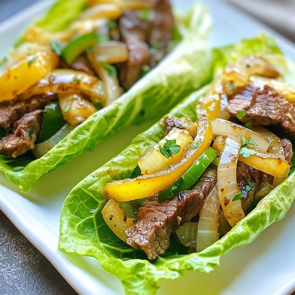 - 1 lb thinly sliced ribeye steak - 1 tablespoon olive oil - 1 medium onion, sliced - 1 medium green bell pepper, sliced - 6 oz provolone cheese slices - 6 large lettuce leaves (romaine or iceberg) - 1 teaspoon garlic powder - Salt and pepper to taste - Optional: Hot sauce for serving The key to a great Keto Philly Cheesesteak Roll Up lies in the ingredients. Ribeye steak brings rich flavor and tenderness. Use thinly sliced meat for quick cooking and easy rolling. Olive oil helps cook the vegetables and adds healthy fats. Onions and bell peppers add sweetness and crunch. They caramelize nicely when sautéed, making the dish more tasty. Provolone cheese melts well, creating a creamy texture. The lettuce leaves serve as a low-carb wrap, making this dish keto-friendly. Each serving contains about 350 calories. The breakdown reveals that you get around 25g of protein, 25g of fat, and only 5g of carbs. This makes it a great option for a keto meal. The combination of protein and fat keeps you full longer, while the low carbs support your diet goals. With these ingredients, you're set to make a delicious meal. Enjoy the flavors while sticking to your keto plan! {{ingredient_image_1}} 1. Start by heating 1 tablespoon of olive oil in a large skillet over medium heat. 2. Add the sliced onion and green bell pepper. Sauté them for about 5-7 minutes. Wait until they are soft and slightly caramelized. 3. Push the veggies to one side of the skillet. Add the 1 lb of thinly sliced ribeye steak to the other side. Season it with 1 teaspoon of garlic powder, salt, and pepper. 4. Cook the steak for about 3-4 minutes. Stir occasionally until the meat is browned and fully cooked. 5. Once the steak is done, mix it with the veggies in the skillet and take it off the heat. 1. Grab 6 large lettuce leaves, either romaine or iceberg. Lay them out flat. 2. Place 2 slices of provolone cheese on each leaf. 3. Spoon the steak and vegetable mixture evenly over the cheese in each lettuce leaf. 4. Start at one end of the lettuce leaf and carefully roll it tightly around the filling. This technique helps keep the roll-up secure. 5. Repeat this process for all the lettuce leaves you have. 1. For a nice presentation, you can secure the rolls with a toothpick if you like. 2. If you want some heat, drizzle hot sauce over the top before serving. This adds a spicy kick that many enjoy. To make tender ribeye steak, choose thinly sliced cuts. Look for marbling, which adds flavor. Cook over medium heat for even cooking. Avoid overcooking; 3-4 minutes is perfect. To prevent soggy roll-ups, dry the lettuce leaves well. Use sturdy lettuce like romaine or iceberg. Layer cheese first to create a barrier. This keeps moisture from softening the leaves. Try different spices to boost flavor. Smoked paprika adds warmth. Italian seasoning gives an herby touch. A pinch of cayenne pepper can add heat. For toppings, consider fresh herbs like parsley or cilantro. A sprinkle of crushed red pepper adds spice. Try avocado slices for creaminess. Hot sauce is great for a kick! Pro Tips Choose Quality Meat: Opt for high-quality ribeye steak for the best flavor and tenderness in your roll-ups. Don't Overcook the Vegetables: Sauté the onions and bell peppers just until soft for the perfect texture; they should complement the steak without losing their crunch. Experiment with Cheeses: While provolone is traditional, feel free to mix in other cheeses like mozzarella or cheddar for a unique twist on flavor. Make It Spicy: For an added kick, include sliced jalapeños in the filling or drizzle your roll-ups with your favorite hot sauce before serving. {{image_2}} You can change the protein in your roll-ups. Try chicken or turkey instead of ribeye. These meats cook fast, and they taste great with the same seasonings. If you want a lighter option, shredded chicken works well. Cheese is another area for swaps. While provolone is classic, you can use mozzarella for a milder taste. Cheddar adds a sharp flavor that many love. You could also try pepper jack for a spicy twist. Each cheese brings its own style to the dish. You can add more veggies to your roll-ups. Sliced zucchini or mushrooms add flavor and crunch. Spinach leaves can also replace lettuce for a different texture. These options keep the meal low-carb and add more nutrients. Making homemade sauces is easy and fun. A garlic aioli can add creaminess and depth. Mix mayonnaise with garlic and lemon juice for a quick sauce. Another option is a simple ranch dip, which pairs well with the flavors in the roll-ups. These sauces enhance your meal and keep it exciting. To keep your Keto Philly Cheesesteak Roll Ups fresh, store any leftovers in the fridge. Use airtight containers to prevent moisture loss and keep the flavors intact. A glass or plastic container works best. Make sure to separate the roll-ups if you have extra sauce or toppings to avoid sogginess. When reheating, you want to keep the texture nice. The best method is to use a skillet. Heat it on low to medium heat. Place the roll-ups in the skillet for about 3-5 minutes. Flip them halfway through to warm evenly. Avoid the microwave, as it makes the lettuce limp. Enjoy the fresh flavors as if they were just made! Yes, you can make Keto Philly Cheesesteak Roll Ups ahead of time. Prepare the filling and store it in the fridge for up to three days. Keep the lettuce leaves separate to avoid sogginess. When you're ready to eat, assemble the roll-ups quickly. This saves time and makes meals easy. This recipe is great for meal prep! You can cook a larger batch and store it. Prepare the filling in bulk and freeze it in portions. When you want to eat, just thaw and assemble your roll-ups. This method works well for quick lunches or dinners during busy weeks. Yes, you can use different cheeses! Swiss cheese or cheddar can work well, too. Each cheese brings its own flavor. Swiss adds a nutty taste, while cheddar has a sharp bite. Feel free to experiment and find