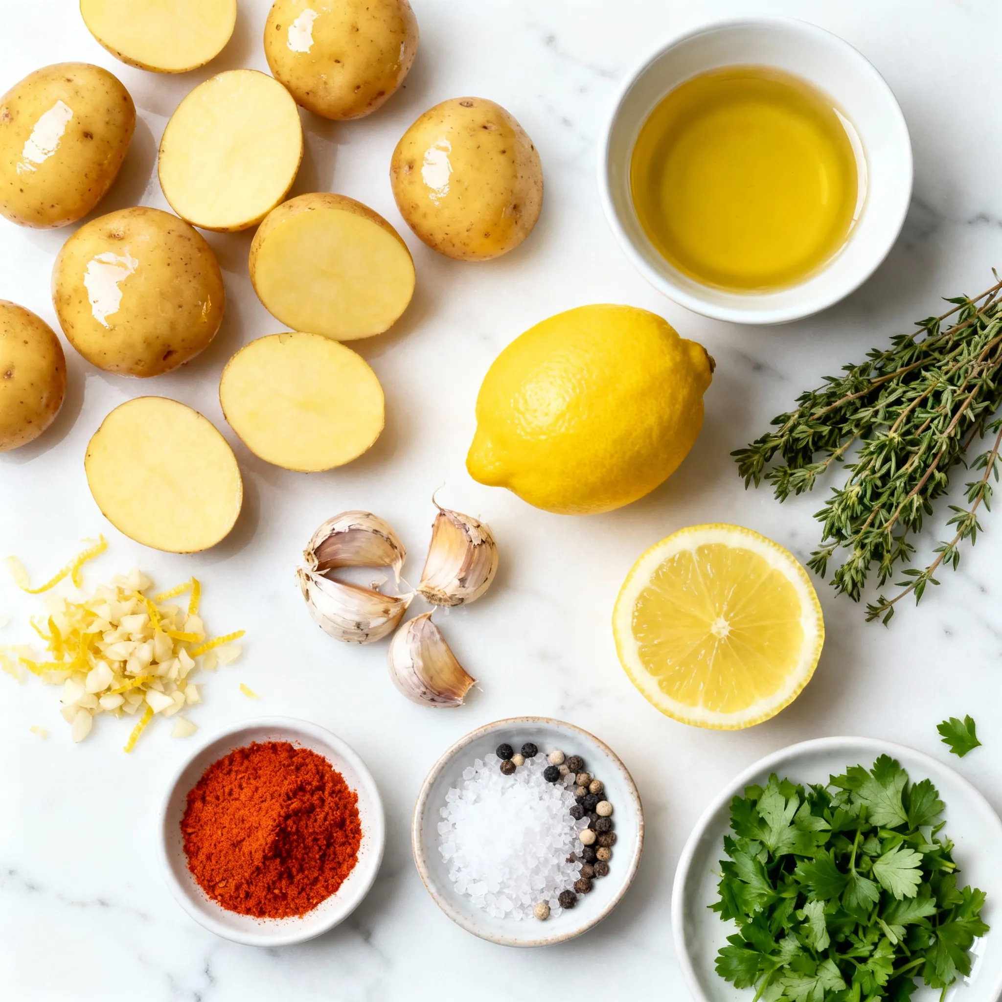 Start by cutting the baby potatoes in half. This helps them cook evenly. Next, mince the garlic. Fresh garlic adds a strong flavor. Finally, measure out the olive oil and lemon juice. These liquids help the potatoes get crispy.