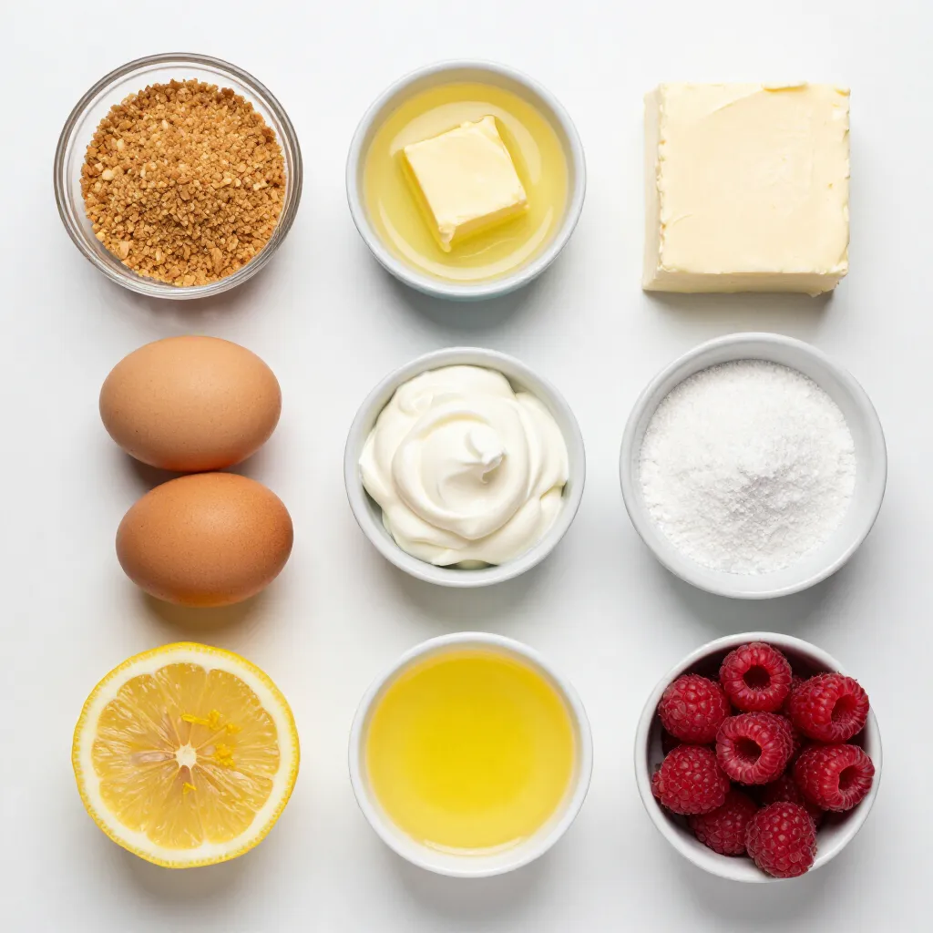 For the Lemon Raspberry Cheesecake Bars, you need a mix of simple, fresh items. The graham cracker crumbs form a crunchy base. You melt unsalted butter and mix it with sugar to bind the crust. Cream cheese gives the filling a rich texture.