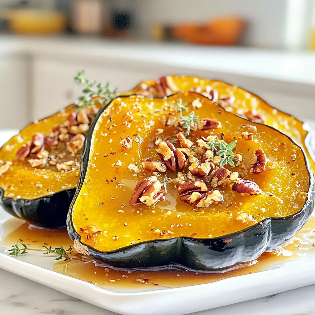 - 2 medium acorn squashes, halved and seeds removed - 4 tablespoons unsalted butter, melted - 1/4 cup pure maple syrup - 1 teaspoon ground cinnamon - 1/2 teaspoon nutmeg - Salt and pepper to taste - Chopped pecans or walnuts for garnish (optional) - Fresh thyme leaves for garnish (optional) When you measure ingredients, be precise for the best taste. Use a liquid measuring cup for the maple syrup. Use a standard measuring spoon for spices and salt. For the butter, melting it first makes it easier to mix. Use a kitchen scale for acorn squash if you want exact weight. Each squash should weigh around one to one and a half pounds. You can swap ingredients to fit your taste. For a vegan option, use coconut oil instead of butter. If you don’t have maple syrup, try honey or agave syrup. Ground ginger can replace cinnamon for a different spice kick. Lastly, if you lack pecans or walnuts, try almonds or sunflower seeds for garnish. First, gather your acorn squashes. You need two medium-sized ones. Cut each squash in half. Use a spoon to scoop out the seeds. You can keep the seeds to roast later if you want a crunchy snack. Place the squash halves cut side up on a baking sheet. Lining the sheet with parchment paper makes cleanup easy. Now, let’s make the maple butter mixture. In a small bowl, melt four tablespoons of unsalted butter. Once melted, add a quarter cup of pure maple syrup. Next, sprinkle in one teaspoon of ground cinnamon and half a teaspoon of nutmeg. Add salt and pepper to taste. Whisk it all together until it looks smooth and combined. This mixture will give the squash a rich flavor. Preheat your oven to 400°F (200°C). It’s important to get the oven hot before roasting. Brush the maple-butter mixture generously over the cut sides of the squash. Make sure to get it into the grooves for full flavor. Place the baking sheet in the oven. Roast the squash for about 30 to 35 minutes. They should become tender and slightly caramelized. Halfway through, brush the squash with the remaining maple-butter mixture. This adds more flavor and helps with caramelization. Once done, let the squash cool for a few minutes before serving. To make the best Maple Butter Roasted Acorn Squash, start with ripe squash. Look for smooth, dark green skin. The size should be medium, not too big. This helps with even cooking. Mix melted butter and maple syrup well. Add spices like cinnamon and nutmeg for warmth. A pinch of salt balances the sweetness. Brush this mixture on the squash generously. Don’t rush; let it soak into the grooves. Consider adding a splash of orange juice for a citrus twist. The bright flavor complements the maple nicely. Experiment with fresh herbs like rosemary or sage for a savory touch. To check if your squash is done, use a fork or knife. Insert it gently into the flesh. If it goes in easily, your squash is ready. Look for a golden-brown color on the edges. This shows it’s caramelized and full of flavor. If you want a sweeter taste, roast it a bit longer. Just watch it closely to avoid burning. Remember, every oven is a bit different, so adjust as needed. Serving your Maple Butter Roasted Acorn Squash nicely makes it special. Place the squash halves on a large plate. Drizzle some maple syrup over them for shine. Sprinkle chopped pecans or walnuts on top for crunch. Fresh thyme leaves add color and a lovely aroma. You can even serve it on a bed of greens for more color. Let your creativity shine! Each plate can look unique. Your guests will love the taste and the look of this dish. {{image_2}} You can add brown sugar to this dish for an extra sweet kick. Mix it with the melted butter and maple syrup. This gives a rich, caramel flavor that makes the squash even more tasty. You can also try adding a pinch of vanilla extract. This adds a warm, sweet aroma that fills your kitchen with joy. Want to give your dish a savory twist? Add minced garlic or shallots to the maple butter mix. This will add a nice punch to the sweetness. You can also sprinkle cheese on top before roasting. Feta or goat cheese works well, adding creaminess to each bite. If you love herbs, fresh rosemary or sage can bring out the squash’s natural flavor. If you need a vegan option, swap the butter for coconut oil. Use maple syrup as your sweetener. This keeps the rich taste while being dairy-free. You can also skip the nuts if you have nut allergies. This dish stays delicious without them, too. Enjoy this recipe while meeting your dietary needs! Once you enjoy your Maple Butter Roasted Acorn Squash, let it cool. Place any leftovers in an airtight container. Store them in the fridge for up to four days. This keeps the flavors fresh and ready for your next meal. Always label the container with the date for easy tracking. Reheating is simple. Preheat your oven to 350°F (175°C). Place the squash halves on a baking sheet. Cover them with foil to keep them moist. Heat for about 15-20 minutes or until warm. You can also use the microwave for quick reheating. Just place the squash on a microwave-safe plate and heat for 2-3 minutes. Freezing acorn squash is easy if you want to save it for later. First, let the squash cool completely. Slice it into smaller pieces for easier storage. Then, place the pieces in a freezer-safe bag. Squeeze out as much air as possible before sealing. You can freeze it for up to three months. Just remember to label the bag with the date! It takes about 30 to 35 minutes to roast acorn squash. You want it to be tender and a bit caramelized. Check it at the 30-minute mark. If it’s not soft enough, give it a few more minutes. This way, you get that sweet, rich flavor. Yes, you can use other squashes! Butternut squash works well and has a sweet taste. Delicata squash is another great choice. Just remember to adjust the cooking time based on the size and type of squash you pick. Each type will bring a unique flavor to your dish. Maple Butter Roasted Acorn Squash pairs well with many dishes. Try