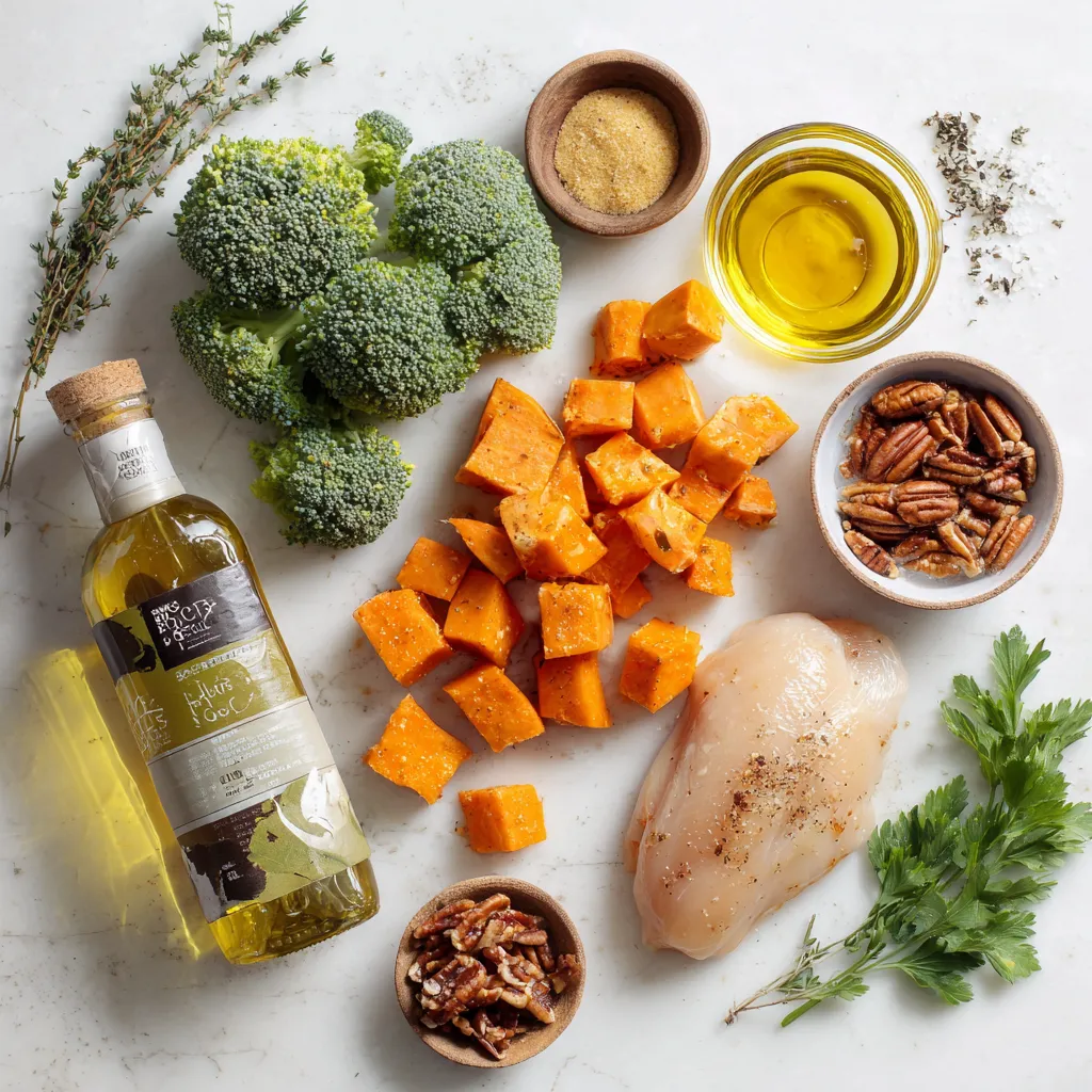 The main ingredients create a great mix of flavors. The chicken gets a sweet and tangy kick from the Dijon mustard and maple syrup. The sweet potatoes add a creamy texture and a hint of sweetness. Broccoli gives a fresh crunch. The pecans provide a nutty bite, while balsamic vinegar adds a nice finish.