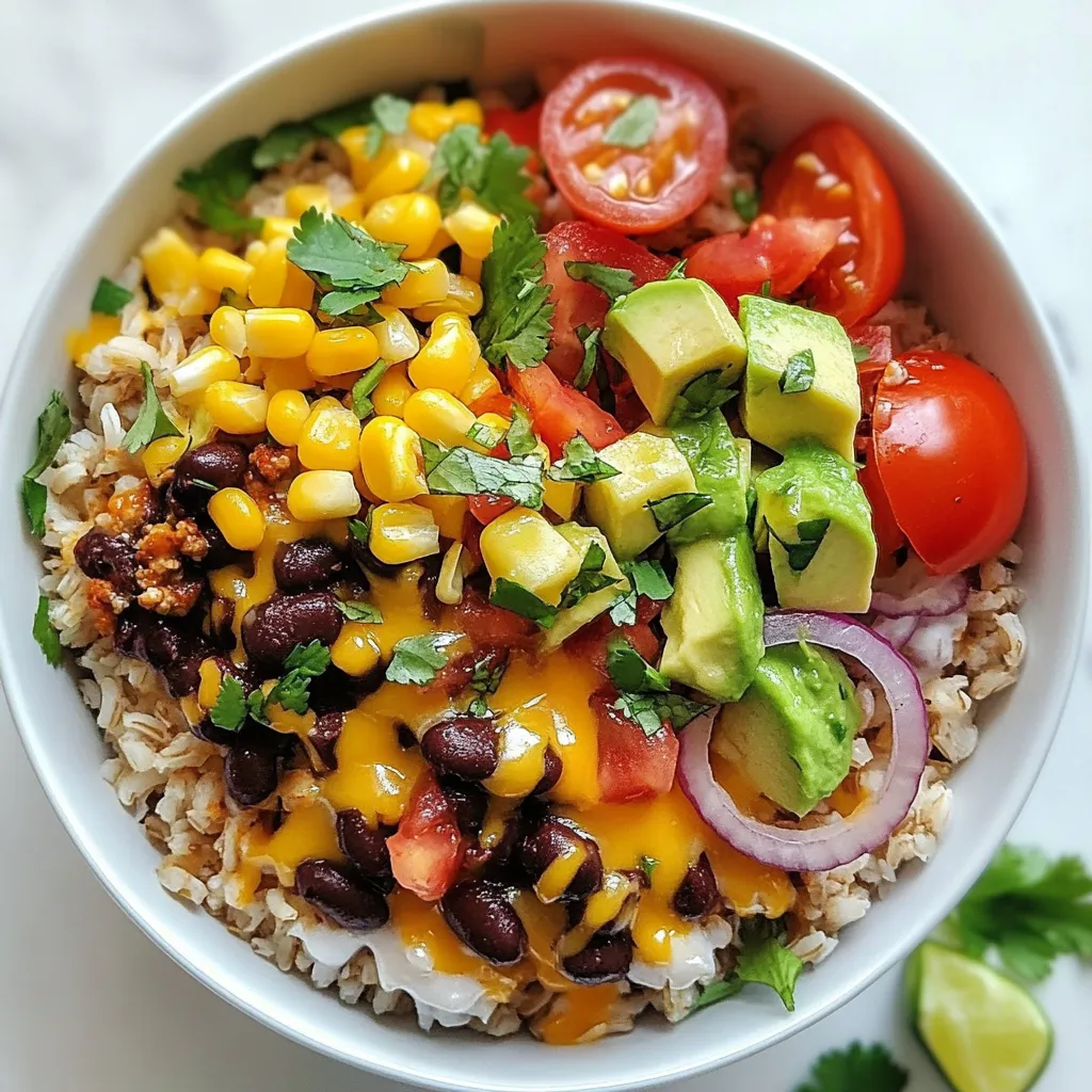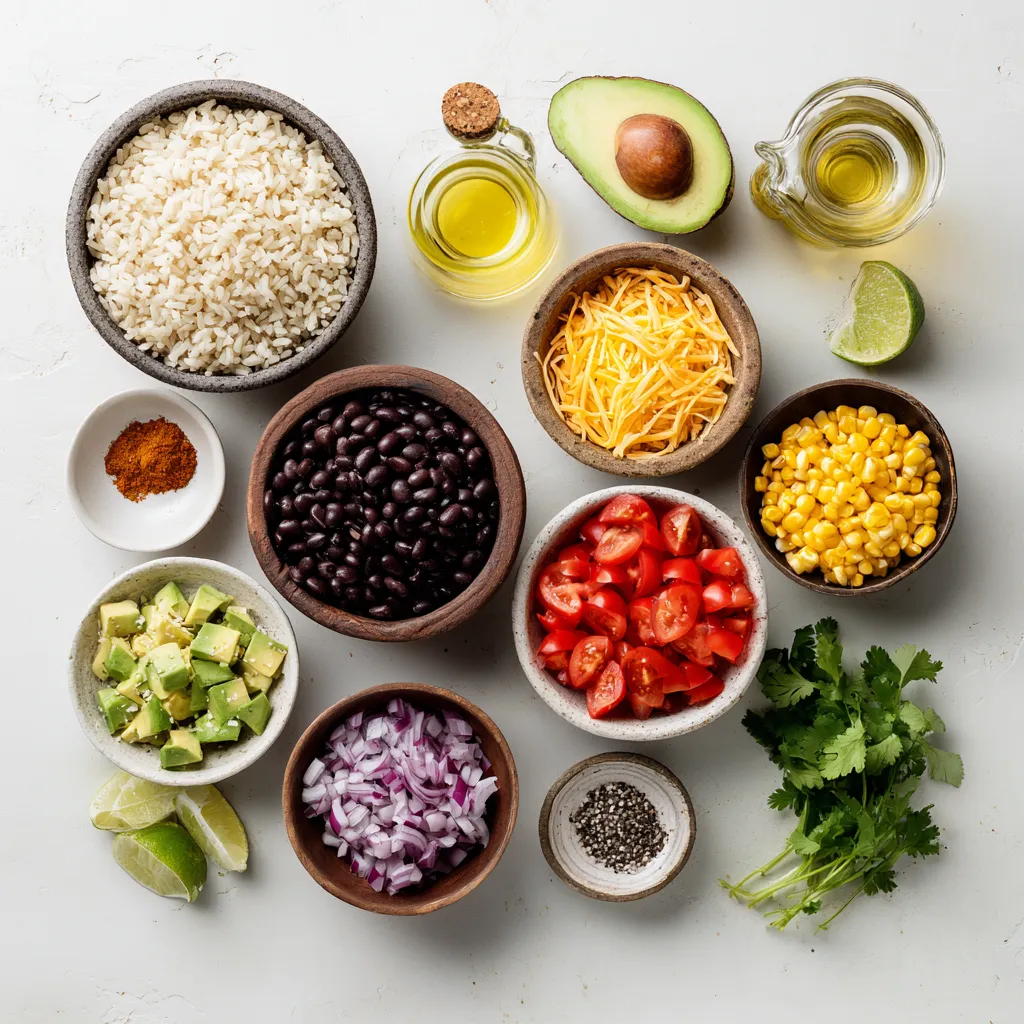 These ingredients create a colorful and filling meal. The brown rice serves as a hearty base. Black beans and corn add protein and sweet flavor. Fresh veggies bring crunch and zest.