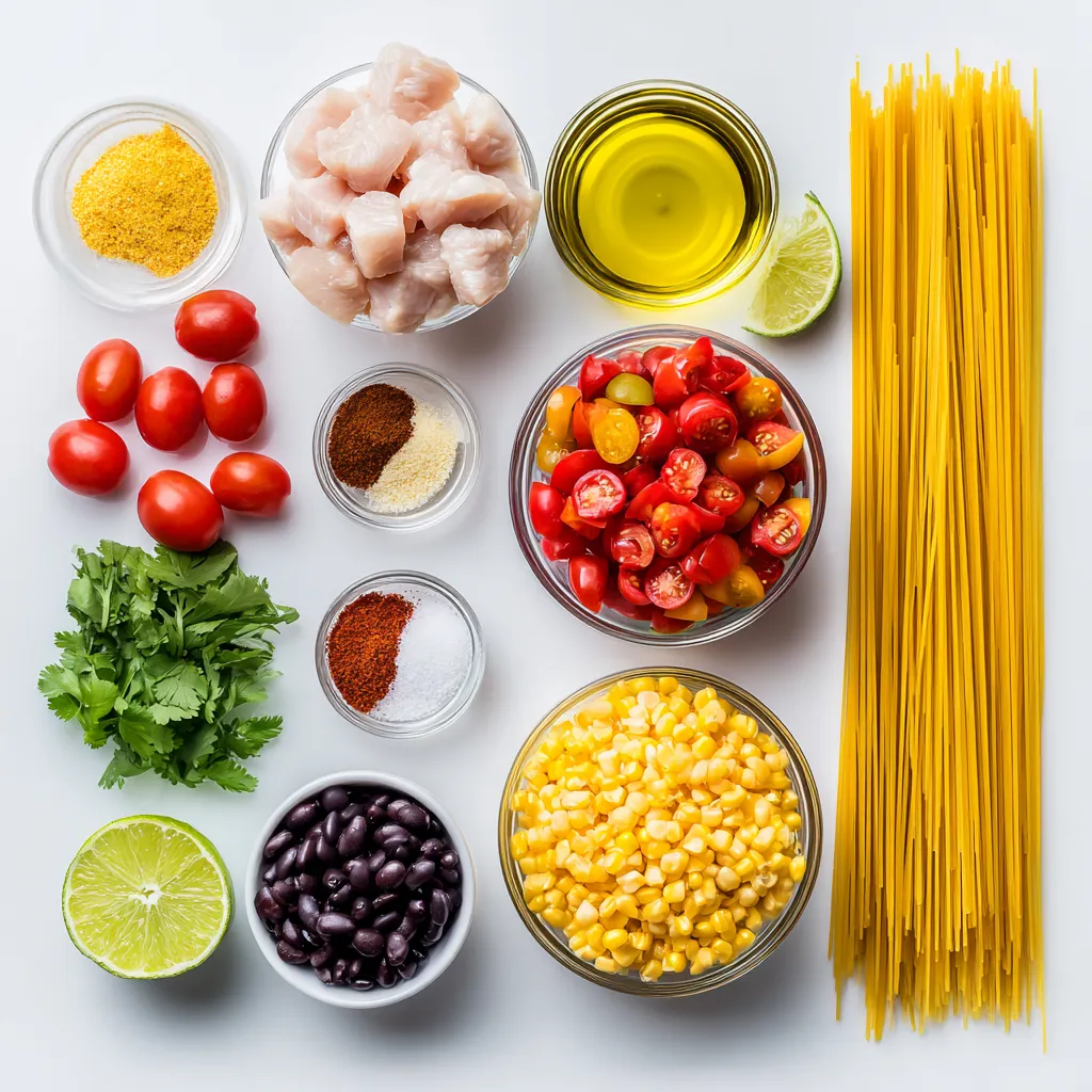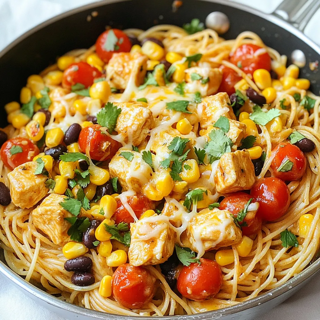 This recipe focuses on fresh produce and flavorful spices. The chicken gives protein, while the spaghetti forms a hearty base. Each spice adds layers of flavor. The cherry tomatoes and corn bring sweet notes, while black beans add texture. Finally, the melting Monterey Jack cheese ties everything together.