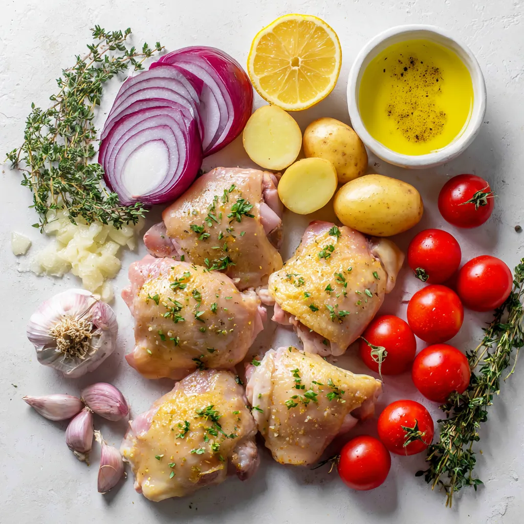 These main ingredients create a hearty base for the dish. The chicken thighs give great flavor and moisture. Baby potatoes add texture and soak up the juices. Red onion brings a bit of sweetness. Garlic adds depth, while cherry tomatoes provide a burst of freshness.