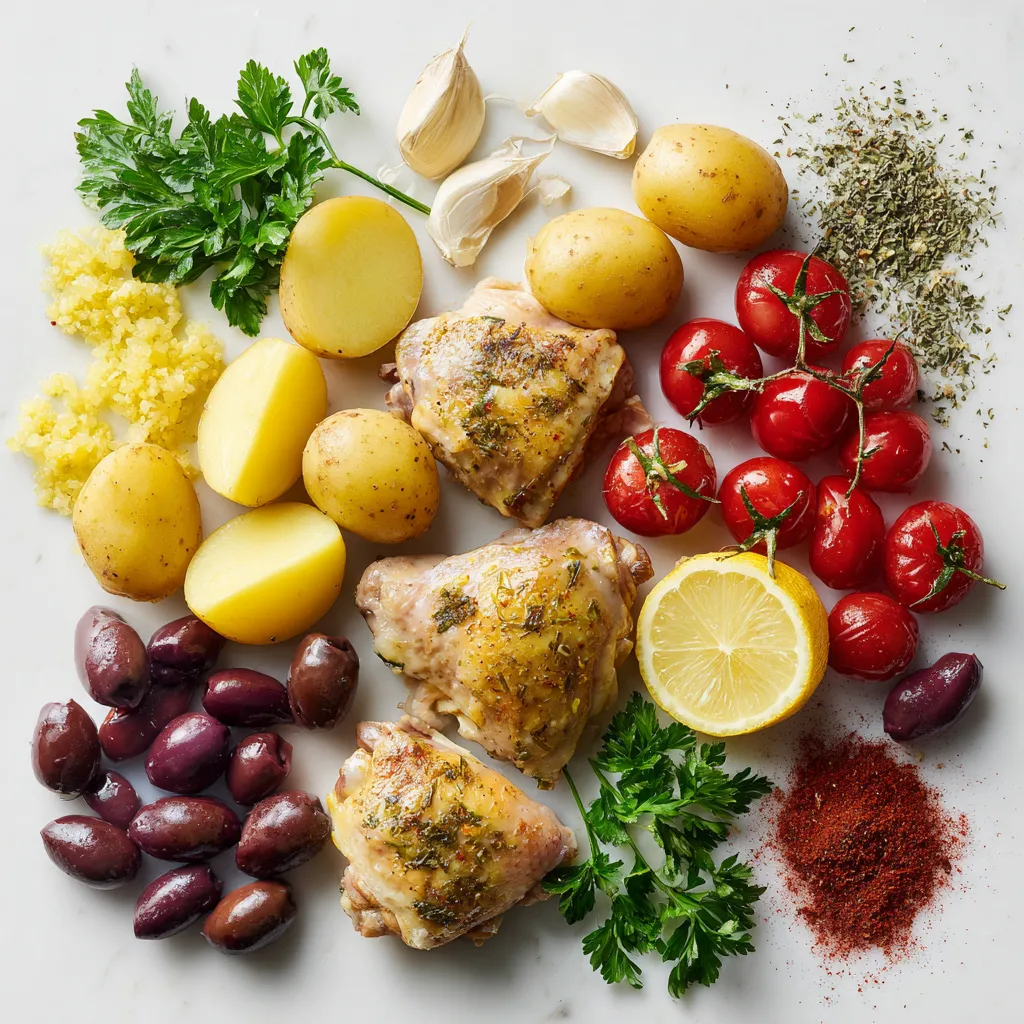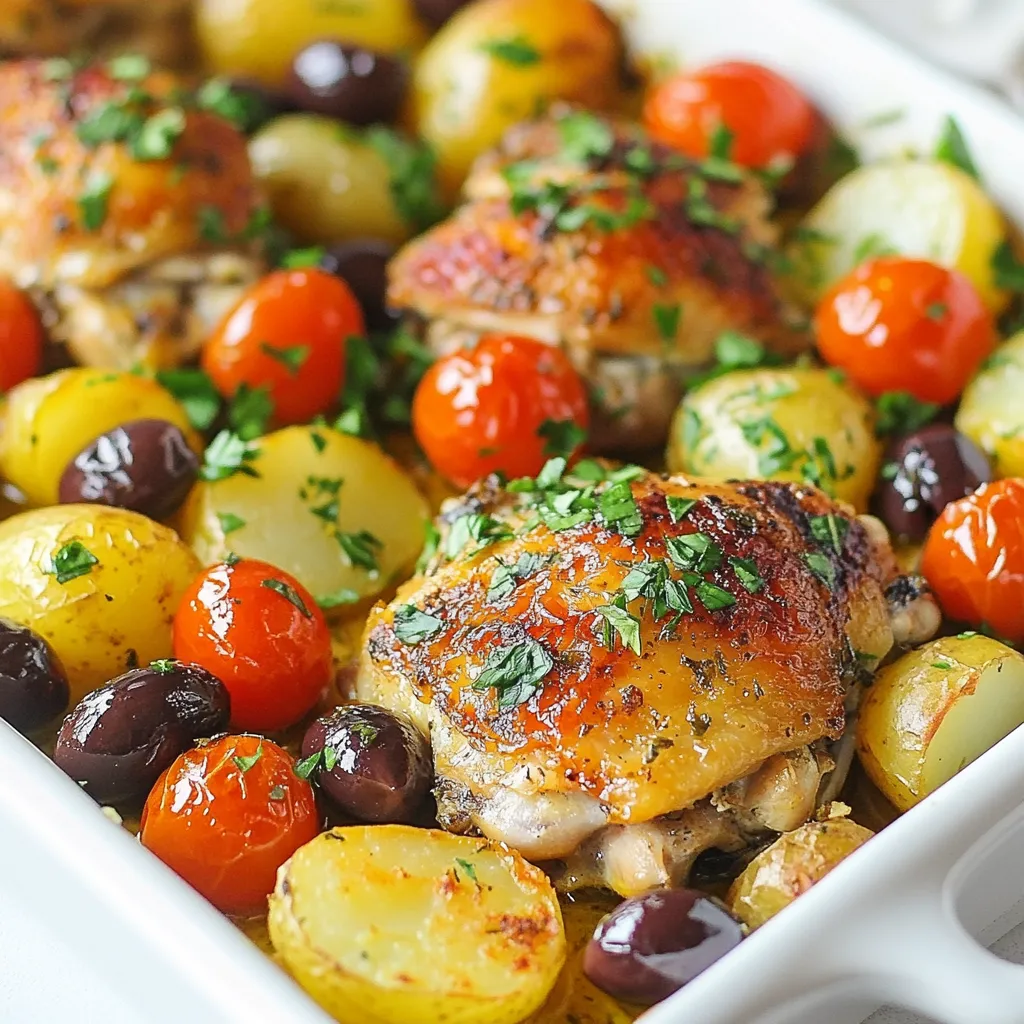 A delicious and easy one-pan meal featuring marinated chicken thighs, tender baby potatoes, and fresh Mediterranean flavors.