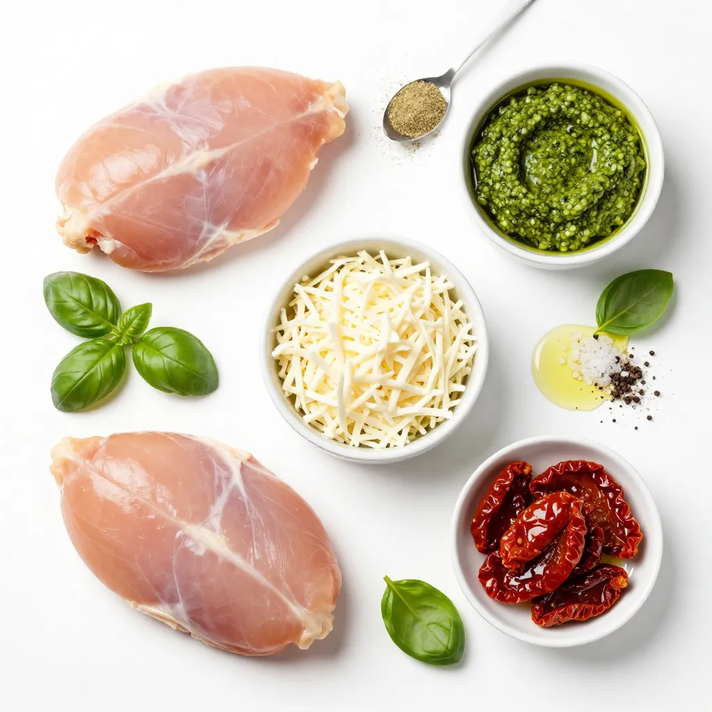 These items blend well and create great flavors. Chicken breasts form the base. Mozzarella adds creaminess. Pesto gives it a fresh herb taste. Sun-dried tomatoes bring a sweet and tangy kick.