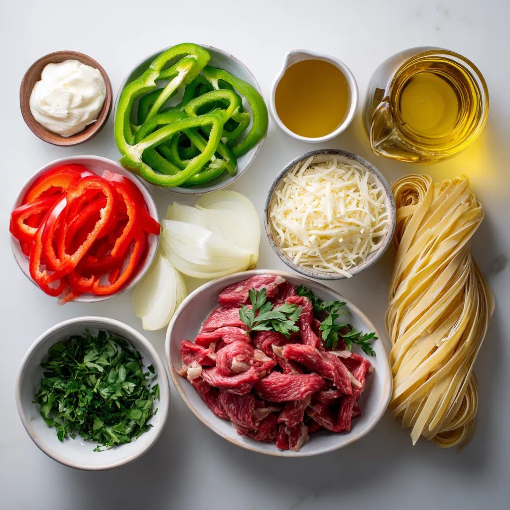 When making Philly cheesesteak pasta, these ingredients shine. The pasta forms the base. Choose fettuccine or penne. Both hold sauce well. The beef sirloin adds rich flavor. Slice it thin for quick cooking. Olive oil helps sauté the beef and veggies.