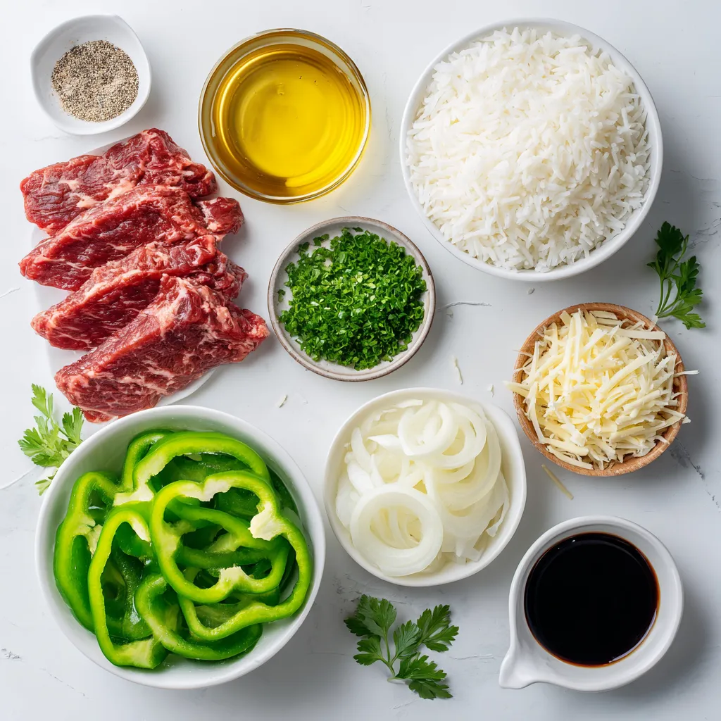 Gathering the right ingredients is key to a great Philly cheesesteak rice bowl. The ribeye steak brings a rich flavor. Slice it thin for the best results. Olive oil adds a nice base for cooking. Sauté the onions and green bell peppers until they are soft. This step makes the dish fragrant and flavorful.