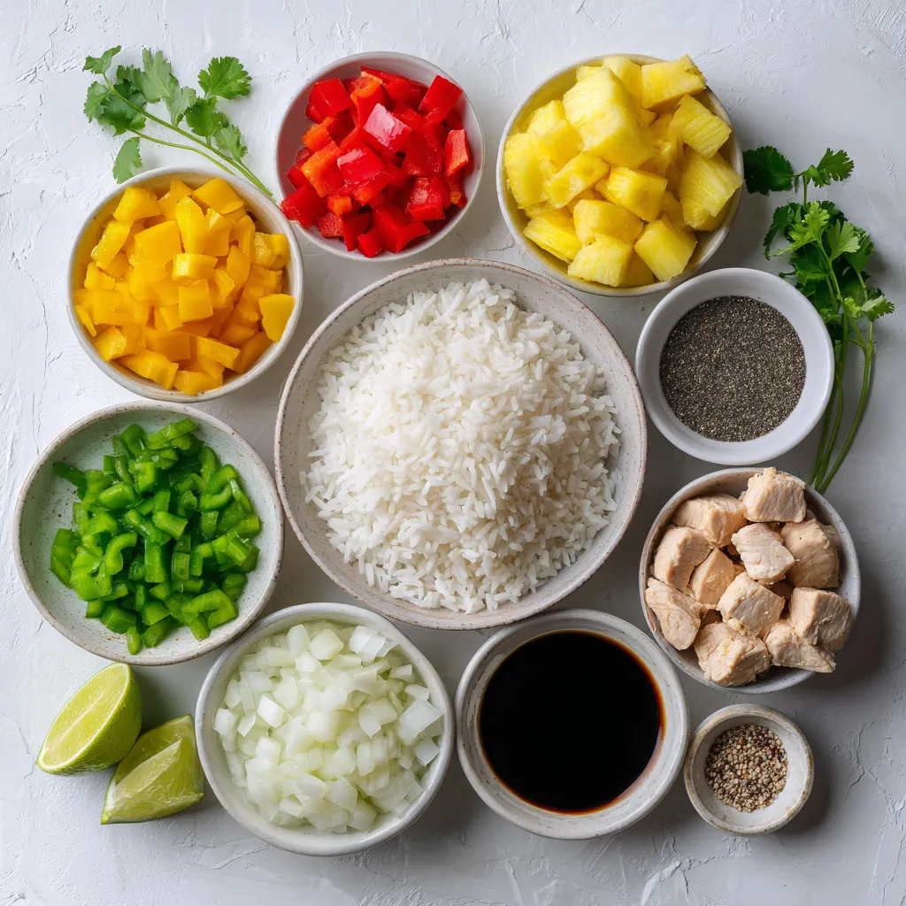 Jasmine rice gives this dish a great texture. It is soft and fragrant. The chicken breast adds protein and heartiness. Pineapple brings sweetness and acidity, which balances the flavors. The bell peppers and onion add color and crunch. Together, these ingredients create a vibrant mix.