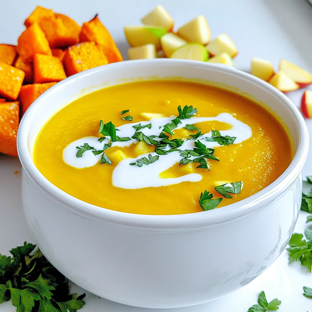 For this Roasted Butternut Squash Apple Soup, you will need the following ingredients: - 1 medium butternut squash, peeled and cubed - 2 medium apples (Granny Smith or Honeycrisp), peeled and diced - 1 large onion, chopped - 3 cloves garlic, minced - 4 cups vegetable broth - 1 tablespoon olive oil - 1 teaspoon ground cinnamon - ½ teaspoon nutmeg - Salt and pepper to taste - ½ cup coconut milk (for creaminess) - Fresh parsley or chives for garnish These ingredients create a warm, rich flavor. The butternut squash brings natural sweetness. The apples add a nice tang. Together, they form the heart of this creamy delight. Don't forget the spices! They elevate the soup's taste. Ground cinnamon and nutmeg add warmth and depth. Make sure to use fresh ingredients for the best flavor. Organic produce can enhance the dish. Each bite should feel hearty and comforting. Trust me; this soup is perfect for chilly days! - Preheat the oven to 400°F (200°C). - In a large bowl, toss the cubed butternut squash and diced apples with: - 1 tablespoon olive oil - Salt and pepper to taste - 1 teaspoon ground cinnamon This step is key for getting great flavor. The olive oil helps the squash and apples roast well. The spices add warmth and sweetness. - Spread the mixture on a baking sheet in a single layer. - Roast for 25-30 minutes. The time in the oven allows the squash and apples to caramelize. This brings out their natural sweetness. When they are tender, you know they are ready. - Heat a large pot over medium heat. - Add 1 chopped onion and sauté until it is translucent, about 5 minutes. - Stir in 3 minced garlic cloves and cook for 1-2 minutes until fragrant. These steps build a great base for your soup. The onion adds depth, and garlic brings a lovely aroma. - Once the squash and apples are done roasting, add them to the pot. - Pour in 4 cups of vegetable broth and bring to a simmer. - Let it simmer for about 10 minutes. This simmering time blends all the flavors. - Use an immersion blender to puree the soup until smooth. - Stir in ½ cup of coconut milk and ½ teaspoon of nutmeg. - Adjust the seasoning with more salt and pepper if needed. The coconut milk makes the soup creamy and rich. - Allow the soup to gently heat through for about 5 minutes before serving. This final step ensures every bite is warm and comforting. To make your soup great, start with even cubing of the butternut squash. Cut the pieces into similar sizes. This helps them cook at the same rate. When you roast them, aim for caramelization. This browning adds deep, rich flavors to your soup. Want a sweeter soup? Try adding more apples or a touch of maple syrup. If you like spice, a pinch of cayenne pepper or a dash of hot sauce can bring some heat. Taste as you go. Adjust until it’s just right for you. For a vegan twist, swap out coconut milk for almond milk or cashew cream. Both will give you a creamy texture, with less fat. Choose unsweetened varieties to keep the flavors balanced. These options keep your soup rich without dairy. {{image_2}} You can boost nutrition by adding more veggies. Carrots add sweetness and color. Sweet potatoes bring creaminess and a rich flavor. Leeks offer a mild taste and a touch of onion flavor. Simply chop them and roast them with the butternut squash. This method will keep your soup tasty and vibrant. To enhance the flavor, consider adding ginger or herbs. Fresh ginger gives a warm, zesty note. You can also try thyme or rosemary for a herby twist. Adding these ingredients while cooking the onions will infuse the soup with deep flavors. Experimenting with different herbs can create a unique taste each time. If you like heat, add chili flakes or jalapeños. Start with a small amount, then taste as you go. This will ensure you achieve your desired level of spice. The heat from these ingredients pairs well with the natural sweetness of the squash and apples. It transforms the soup into a comforting yet exciting dish. After enjoying your Roasted Butternut Squash Apple Soup, let it cool. Pour the soup into an airtight container. This keeps the flavors fresh. Store it in the fridge for up to five days. If you want to enjoy it later, consider freezing it instead. To freeze the soup, use freezer-safe containers. Fill them but leave some space for expansion. This soup freezes well for up to three months. When you are ready to eat, thaw it in the fridge overnight. Reheat the soup gently on the stove. Stir it well to keep the texture smooth. This delicious soup stays fresh for about five days in the fridge. If you freeze it, you can enjoy it for three months. Keep an eye on the smell and color. If it changes, it’s best to toss it. Always trust your senses when it comes to food safety! I recommend using Granny Smith or Honeycrisp apples. These apples add a nice balance of tartness and sweetness. Granny Smith gives a tangy flavor that cuts through the creaminess. Honeycrisp is sweet and juicy, adding a lovely texture. Yes, you can use fresh butternut squash! To prepare it, first, peel the squash with a sharp knife. The skin can be tough. Cut it in half and scoop out the seeds. Then, cube the flesh into even pieces for even cooking. Making this soup takes about 55 minutes. You’ll spend 15 minutes prepping the ingredients. The roasting takes around 25 to 30 minutes, and the cooking and blending take about 15 minutes. You can use chicken broth if you want. It will add a richer flavor to the soup. However, it makes the soup non-vegetarian. Vegetable broth keeps it light and plant-based, so choose what fits your diet best. This blog post guided you through making Roasted Butternut Squash Apple Soup. You learned about essential ingredients, from butternut squash to coconut milk. I detailed simple steps for prep, roasting, and blending to get a creamy texture. I also shared tips for flavor adjustments and variations to cater to your taste. Plus, I covered storage info to keep your soup fresh. With this recipe, you ca
