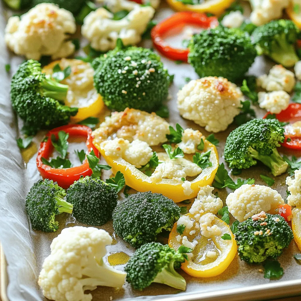 For this dish, you will need: - 2 cups broccoli florets - 2 cups cauliflower florets - 1 cup baby carrots, halved - 1 cup bell peppers, sliced (any color) These veggies give a nice mix of colors and textures. Broccoli and cauliflower provide crunch, while carrots add sweetness. Bell peppers bring in a burst of flavor. You’ll also need some key seasonings: - 6 cloves of garlic, minced - 1/4 cup olive oil - 1 teaspoon dried oregano - 1 teaspoon black pepper - 1 teaspoon salt The garlic adds a rich taste. Olive oil helps the veggies roast nicely. Oregano, salt, and pepper bring everything together. For a finishing touch, consider: - Fresh parsley for garnish (optional) Parsley adds a pop of color and freshness. It makes the dish look even better! First, you need to preheat your oven. Set it to 425°F (220°C). This heat will help your veggies roast well. Next, grab a large mixing bowl. Add 2 cups of broccoli florets, 2 cups of cauliflower florets, 1 cup of halved baby carrots, and 1 cup of sliced bell peppers. You can use any color of bell pepper you like. Make sure all the veggies are clean and dry. This step helps them roast nicely. Now, let’s make the garlic and olive oil mix. Take a small bowl and add 6 minced garlic cloves. Pour in 1/4 cup of olive oil. Then, add 1 teaspoon of dried oregano, 1 teaspoon of salt, and 1 teaspoon of black pepper. Whisk this mixture well until all the ingredients blend together. This mix adds great flavor to your veggies. Pour the garlic mixture over the veggies in the large bowl. Toss them well so that every piece gets coated. Next, spread the veggies out on a baking sheet lined with parchment paper. Make sure they are in a single layer. Place the baking sheet in your preheated oven. Roast for 20 minutes. After 20 minutes, take the baking sheet out. Sprinkle 1/2 cup of grated Parmesan cheese over the veggies. Return the baking sheet to the oven. Roast for an additional 10 to 15 minutes. Your veggies should become tender, and the cheese should be golden and bubbly. Once done, take them out and add fresh parsley on top if you want. To make sure your veggies cook evenly, cut them into similar sizes. For example, keep broccoli and cauliflower florets about the same size. Slice your bell peppers and carrots into pieces that match the size of the florets. This way, everything cooks at the same rate. Also, space the veggies out on the baking sheet. Too many veggies crowded together can lead to steaming instead of roasting. Choose fresh, vibrant vegetables. Look for broccoli and cauliflower with firm florets. For bell peppers, pick ones that are shiny and have no soft spots. Baby carrots should be bright orange and crisp. You can mix in other veggies too, like zucchini or asparagus, for extra flavor and color. Just remember to adjust the cooking time if you use softer vegetables. You can change the seasoning to fit your taste. If you love garlic, add more than six cloves. If you want some heat, try adding a pinch of red pepper flakes. Taste the veggie mixture before roasting to see if it needs more salt or pepper. Feel free to get creative. You can even switch out the oregano for thyme or rosemary. Just make sure to mix well so every bite is full of flavor. {{image_2}} You can mix in many veggies for roasted garlic parmesan veggies. Try zucchini, asparagus, or green beans. Each adds its own taste and texture. Cut these vegetables into similar sizes. This helps them cook evenly. You can also use seasonal vegetables. They often taste better and are fresher. If you want a different flavor, try cheese alternatives. Grated mozzarella or feta cheese works well. They melt nicely and add creaminess. For a dairy-free option, use nutritional yeast. It gives a cheesy taste without milk. Just sprinkle it on top before roasting. To spice things up, add your favorite seasonings. Red pepper flakes give a nice kick. If you love herbs, try thyme or rosemary. These herbs pair well with garlic and cheese. You can also add lemon zest for a fresh twist. This brightens the dish and adds a zing. Experiment and find your perfect flavor! Store your roasted garlic Parmesan veggies in an airtight container. They can stay in the fridge for up to four days. If you want to enjoy them later, let them cool before sealing. This keeps the veggies fresh and tasty. To reheat, use your oven or microwave. For the oven, preheat it to 350°F (175°C). Spread the veggies on a baking sheet. Heat them for about 10-15 minutes. This way, they stay crispy. In the microwave, place the veggies in a bowl and cover them. Heat for 2-3 minutes until warm. You can freeze the roasted veggies, but they may lose some crunch. Let them cool completely. Place them in a freezer-safe bag or container. They can last up to three months in the freezer. When you want to use them, thaw in the fridge overnight. Then, reheat as mentioned above. Enjoy your veggies any time! Yes, you can use frozen vegetables. Just make sure to thaw them first. Drain any excess water. This helps the veggies roast well. They may cook faster than fresh veggies, so keep an eye on them. To make this dish vegan, skip the Parmesan cheese. You can use nutritional yeast instead. It adds a cheesy flavor without dairy. You can also try vegan cheese, which melts nicely. You can mix in many seasonings. Try adding paprika for a smoky taste. Red pepper flakes give heat. Fresh herbs like thyme or rosemary work great too. Feel free to experiment with your favorites! You learned about fresh veggies, seasonings, and fun garnishes. I shared steps for prepping, roasting, and adding cheese. You now know tips for even cooking and choosing veggies. You can even explore variations and ways to store leftovers. Remember, cooking is personal. Feel free to make it yours. Enjoy your tasty creation!