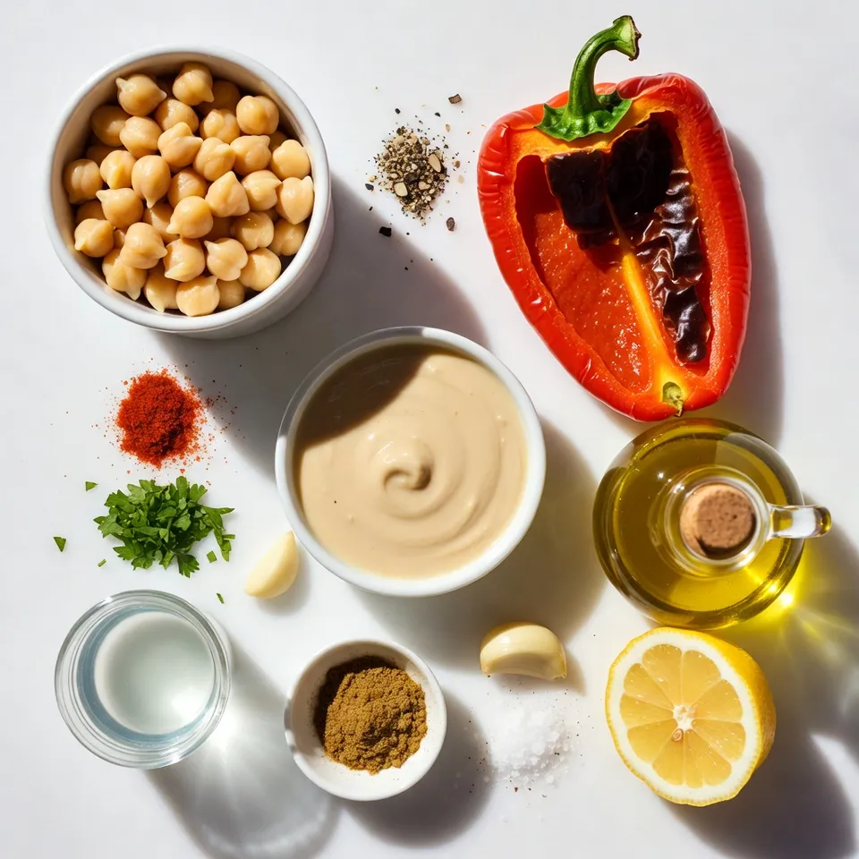 These ingredients create a rich base for your hummus. Canned chickpeas are easy and quick. Roasted red peppers add a sweet, smoky flavor. Tahini gives it a creamy texture, while olive oil adds richness.