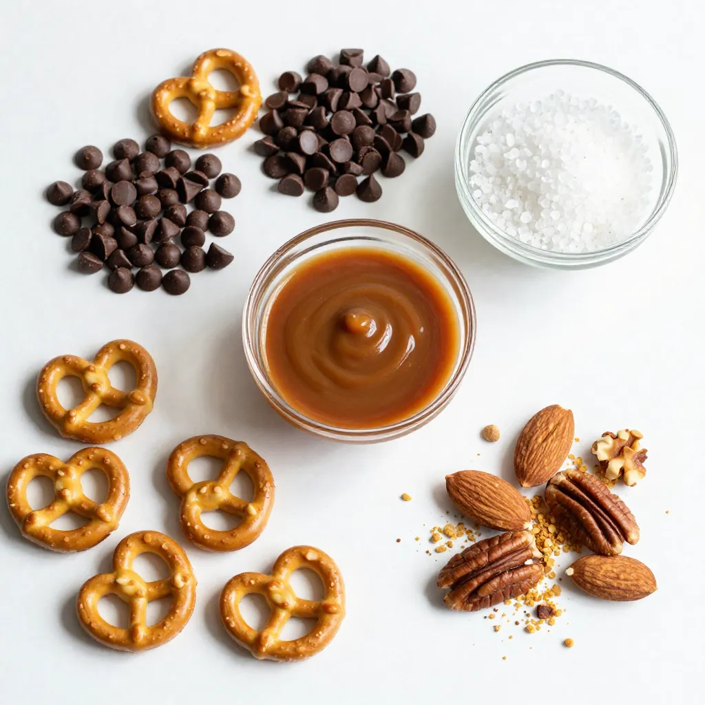 - 2 cups mini pretzels - 1 cup semi-sweet chocolate chips - 1 cup caramel sauce - 1 teaspoon sea salt - 1/2 cup crushed nuts (optional) When I make salted caramel pretzel bark, I love using mini pretzels. They are small, crunchy, and perfect for this treat. You need two cups to create a great base. Next, I use one cup of semi-sweet chocolate chips. They melt nicely and add a rich flavor. Caramel sauce is the star of this recipe. You can use store-bought or homemade if you prefer. One cup should be enough to cover the pretzels. Don’t forget the sea salt! One teaspoon adds the perfect touch. It balances the sweetness and gives that irresistible taste. If you want to add more texture, crushed nuts work well. Pecans or almonds are my favorites. Just half a cup of these nuts adds crunch and flavor. This combination of ingredients makes the bark a sweet and salty delight. {{ingredient_image_1}} - Preheat your oven to 350°F (175°C). This helps get the pretzels nice and crunchy. - Line a baking sheet with parchment paper. This makes it easy to lift the bark later. - Spread the mini pretzels evenly on the baking sheet. Make sure they are in a single layer. - Bake the pretzels for about 5-7 minutes. They should be slightly toasted but not burnt. Remove them and let them cool for a few minutes. - In a small saucepan, gently heat the caramel sauce over medium-low heat. Stir it until it becomes smooth. - If the caramel is too thick, add a splash of water or cream to loosen it. This helps it pour easily over the pretzels. - Pour the warm caramel sauce evenly over the pretzels. Make sure every pretzel gets a good coat. - Melt the semi-sweet chocolate chips in a microwave-safe bowl. Do this in 30-second intervals, stirring in between. This keeps the chocolate from burning. - Drizzle the melted chocolate over the caramel-covered pretzels. You can use a spoon or a piping bag for a neat look. - If you want, sprinkle crushed nuts over the top. Then, lightly sprinkle sea salt over the chocolate and caramel layers. - Let the bark cool at room temperature until the chocolate sets. You can speed this up by putting it in the fridge for about 30 minutes. - Once set, break it into pieces and enjoy! To get the best pretzel bark, start with baking your pretzels. Spread them evenly on your baking sheet. Bake them at 350°F (175°C) for about 5-7 minutes. This light toasting brings out their flavor and crunch. Keep an eye on them so they don’t burn! Next, melt your chocolate. Use a microwave-safe bowl. Heat the chocolate chips in 30-second bursts. Stir between each burst until smooth. This method helps prevent burning. A double boiler works well too, if you prefer it. You can switch up the chocolate! Dark chocolate or white chocolate works great too. Each type brings its own flavor twist. Feel free to use a mix of chocolates for a fun look. For toppings, think outside the box! You might try crushed candy canes for a minty kick. Or sprinkle on some coconut flakes for a tropical vibe. Nuts like pecans or almonds add crunch. Don’t be afraid to get creative! Serve your bark in fun ways. Cut it into small pieces for sharing. You can stack them in a jar for a cute display. Wrap them in cellophane for gifts. They make great treats for parties or holidays! Try pairing the bark with a scoop of ice cream. It adds a cool contrast to the sweet, salty flavors. Your friends and family will love it! Pro Tips Use Fresh Caramel Sauce: For the best flavor and consistency, opt for a fresh caramel sauce rather than a jarred one, if possible. Customize Your Toppings: Feel free to experiment with different nuts or even add toppings like crushed pretzel pieces or sprinkles for added texture and flavor. Chill for Quick Setting: If you're in a hurry, place the bark in the refrigerator to help the chocolate set quickly without compromising texture. Cut with a Warm Knife: To achieve clean cuts when breaking the bark, dip your knife in warm water and wipe it dry before slicing. {{image_2}} You can switch up the chocolate in your salted caramel pretzel bark. Try using white chocolate or dark chocolate. White chocolate adds a sweet, creamy taste. Dark chocolate gives a rich, bold flavor. Both options work well with the salty pretzels. You can also add spices like cinnamon. A sprinkle of cinnamon can warm up the snack. It pairs nicely with the sweet caramel and chocolate. If you want a healthier treat, consider using lighter caramel. You can find low-sugar or sugar-free caramel sauces. These options cut down on calories and sugar. For gluten-free snacks, look for gluten-free pretzels. Many brands now offer gluten-free pretzels that taste great. They make a perfect base for this sweet treat. You can get creative with toppings for special occasions. For holidays, try adding festive sprinkles. Red and green sprinkles work well for Christmas. In the fall, you can use orange and yellow candies for Halloween. You can also adapt the snack for birthdays by using colorful candies. Tailoring your salted caramel pretzel bark for each occasion makes it even more fun. To keep your salted caramel pretzel bark fresh, store it in an airtight container. You can use a plastic container or a resealable bag. This helps to keep out air, which can make the bark stale. Place a piece of parchment paper between layers if you stack them. This will help avoid sticking. If you want to freeze the bark, cut it into pieces first. Wrap each piece in plastic wrap. Then, place them in a freezer-safe bag or container. This way, you can easily grab a piece whenever you want a tasty snack. Salted caramel pretzel bark stays fresh for about one week at room temperature. If you store it in the fridge, it can last up to two weeks. In the freezer, the bark can last for about three months. Just make sure to check for any signs of freezer burn before enjoying. The bark takes about 30 minutes in the fridge to set. At room temperature, it may take longer. Watch for the chocolate to har