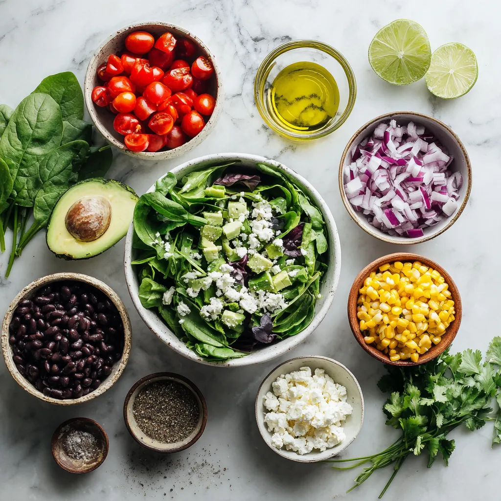 A fresh and vibrant salad featuring mixed greens, black beans, corn, avocado, and a zesty lime dressing.